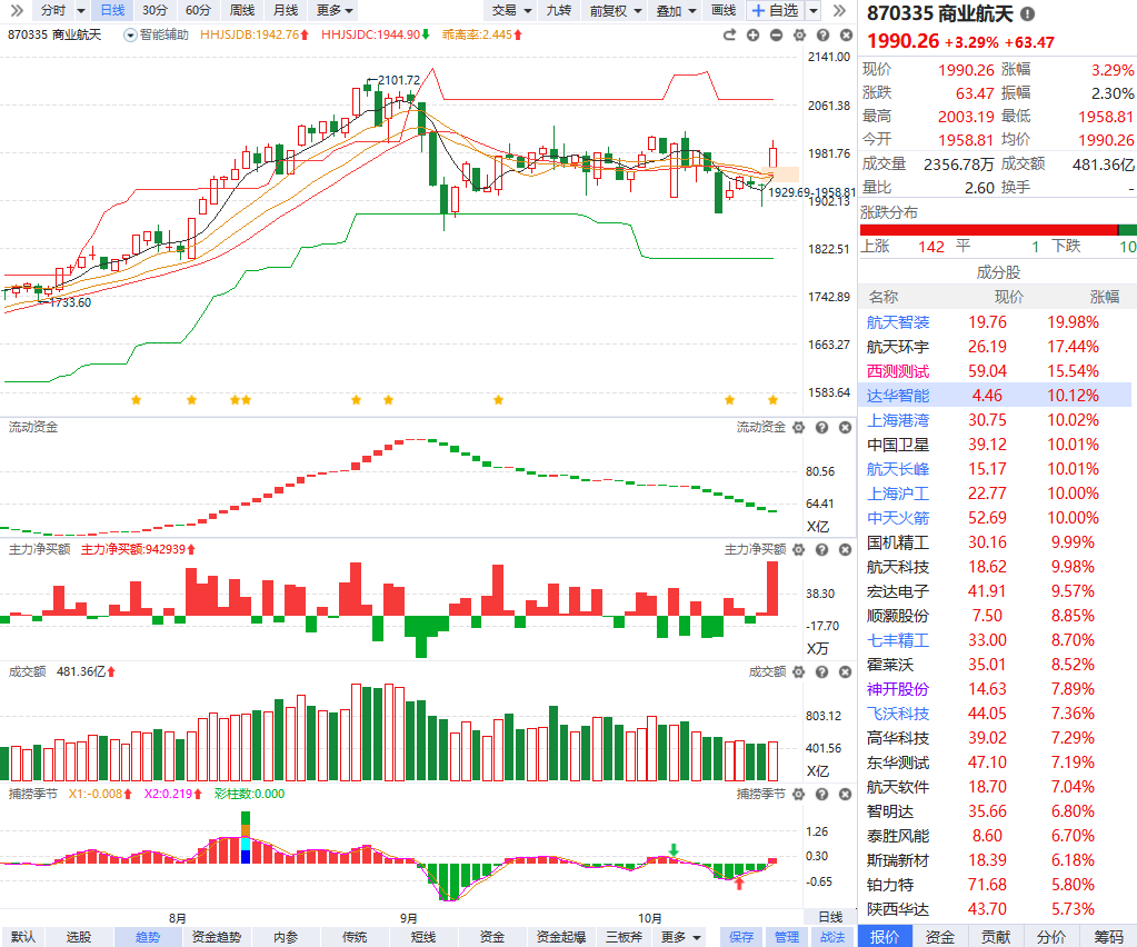 市场早间震荡拉升,创业板指盘中涨超2%。成交量方面,量能明显放大,第一个小时两市放量1378亿元。板块方面,热点轮番活跃,早盘市场热点集中在商业航天和存储芯片等方向,达华智能2连板,航天科技等10余只商业航天概念股涨停。香农芯创、普冉股份大涨双双创新高。下跌方面,煤炭和深圳本地股集体调整,安泰集团、云煤能源触及跌停,深物业A、深纺织A大跌。