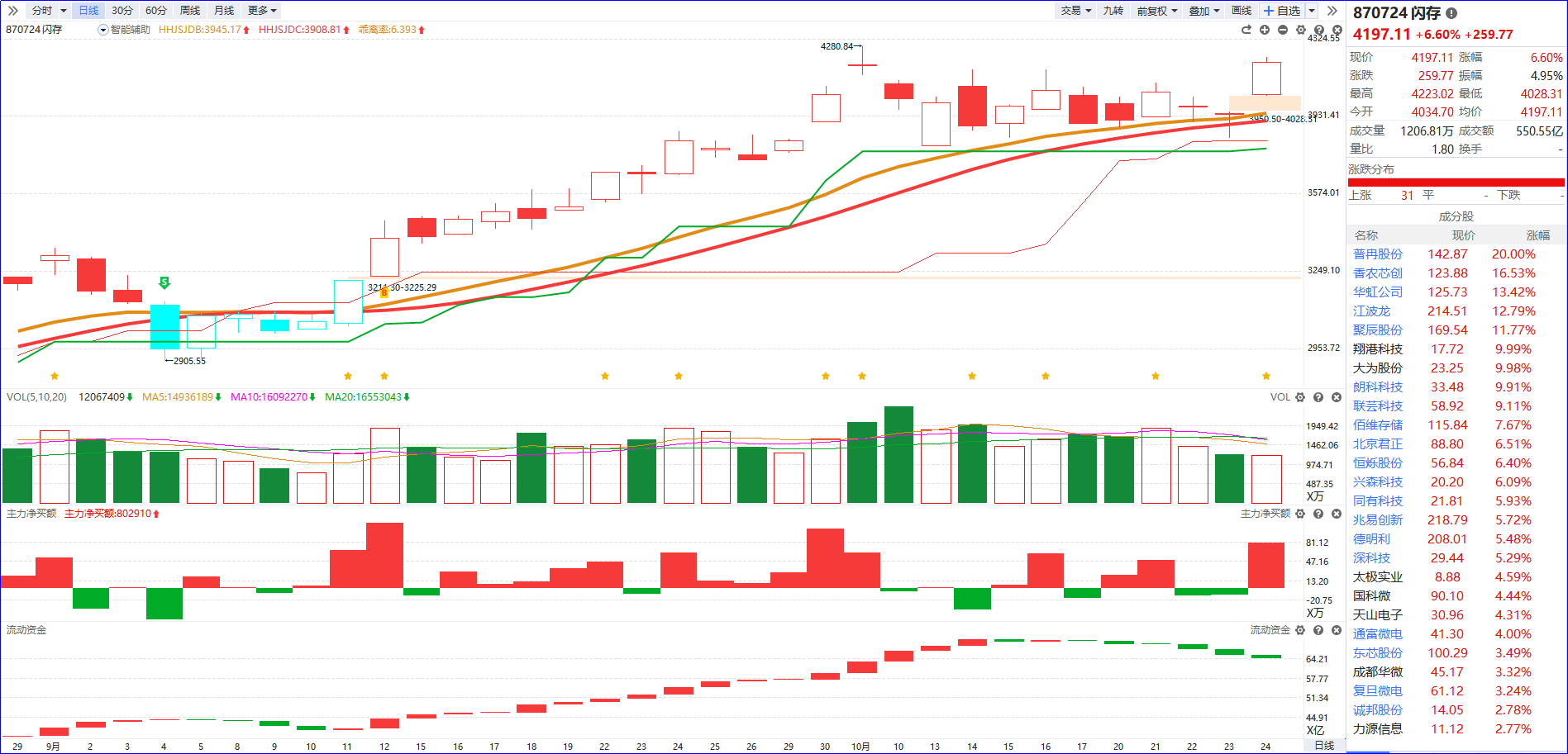 消息面上,据报道,三星电子、SK海力士等主要内存供应商将在今年第四季度向客户调整报价,DRAM和NAND闪存价格上调幅度将高达30%,以满足AI驱动的存储芯片需求激增。此外隔夜美股存储概念股再度走强,SanDisk涨超13%,股价创历史新高。