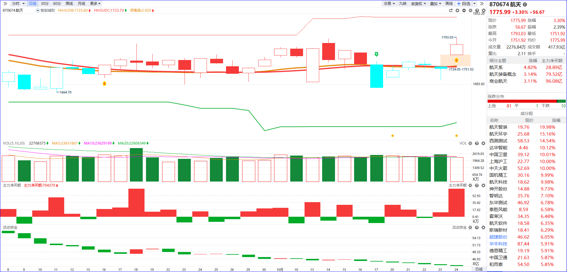 从软件信号看,商业航天板块近期流动资金持续翻绿,主力净买额红肥绿瘦,但板块在消息面刺激下实现关键突破,当前板块处于关键窗口期,核心变量在于增量资金能否快速进场承接:若流动资金迅速切换至翻红状态,将形成消息催化+资金验证的双重驱动,板块有望确认趋势反转拐点。短期操作层面,建议聚焦5日主力资金排序靠前的前排或者连板个股,此类标的更易在资金进场初期抢占流动性先机,率先释放赚钱效应,成为板块趋势反转的先行指标。