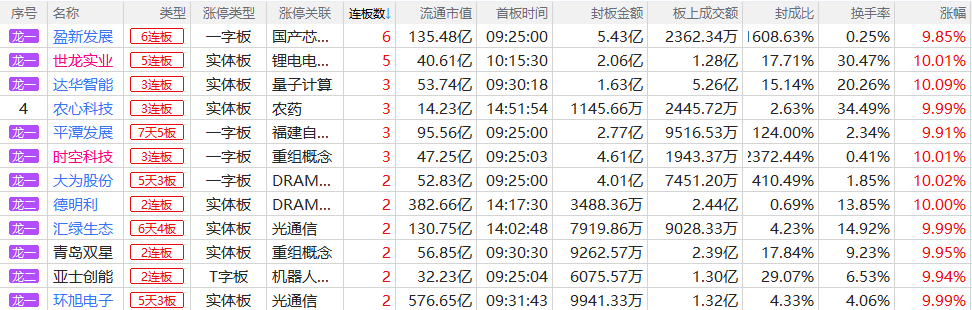 焦点股方面,盈新发展一字涨停晋级6连板,零售板块国光连锁11天6板,氯化亚砜概念股世龙实业5连板,福建本地股平潭发展7天5板。