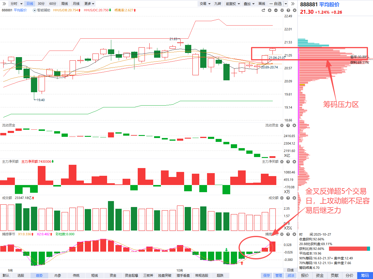 指数角度,大盘方面,GJD控盘的指数就像拼多多的砍一刀,每次看起来无限接近,但就是没办法达成最后一点点进度,今天下午硬拉指数,在4000点附近也非常犹豫,正常来说应该要磨一下,哪怕直接突破也没有多少持续性。平均股价已经金叉反弹超5个交易日,且已经来到筹码峰压力区,如果不能进一步高开高走快速突破筹码密集区,锁住摇摆的筹码,就会逐渐有套牢盘开始兑现,形成分化走势。