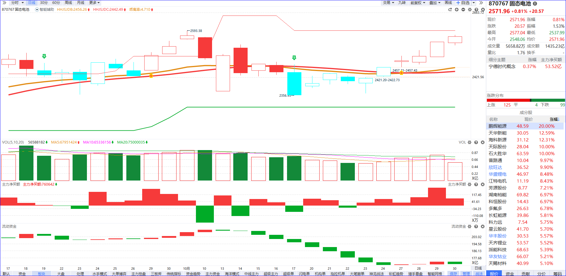 从软件信号看,固态电池板块近期资金面呈现积极信号,流动资金小幅翻红,主力净买额呈现红肥绿瘦的强势格局,K线呈现震荡上行的明确强趋势。当前技术面已实现金叉反弹并延续多个交易日,但需注意:短线急涨行情下,板块内部易出现获利盘分化,高位追涨风险需重点回避。从整体趋势看,板块已突破前期弱势区间转为强势,若后续流动资金能持续维持红盘状态,即便出现死叉调整(预计调整周期3-4个交易日),调整后仍具备短线反弹的操作预期。