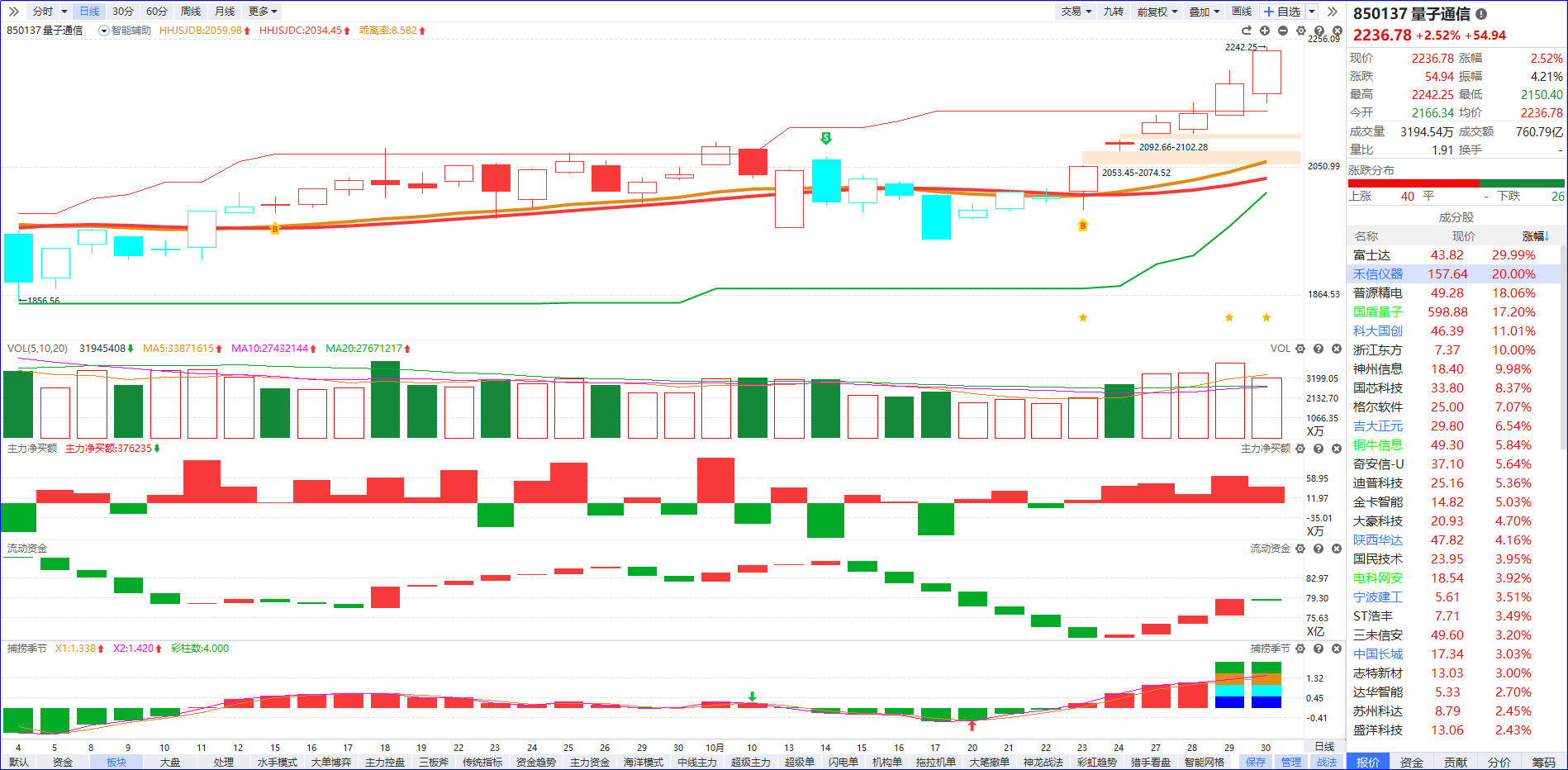 从软件信号看,量子科技概念的流动资金持续翻红态势,主力净买额红肥绿瘦,成功突破前期横盘整理平台,技术趋势突破信号明确。不过需警惕技术面的潜在风险:近两个交易日反弹过程中,捕捞季节指标均出现光头彩柱形态,这一信号往往预示短期技术背离,急涨后板块分化概率显著提升。操作上建议规避高位追涨动作,保持耐心等待分歧回档机会,待调整到位后再择机布局,更符合当前市场节奏。