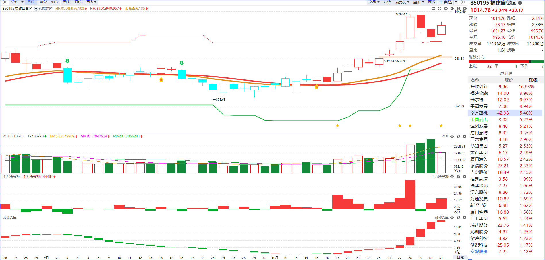 从软件信号看,福建自贸区板块近期市场表现强势,资金面与走势形成正向共振:一方面,流动资金持续保持净流入态势,主力净买额同样呈现红肥绿瘦的积极格局,为板块行情提供了坚实的资金支撑;另一方面,板块整体走出震荡上行的强趋势形态,即使经历两个交易日的震荡整理,也迅速迎来资金回流,趋势韧性凸显。展望后续,若板块能维持资金快速流入节奏、流动资金持续翻红,有望依托当前的趋势基础形成持续性反弹行情。操作层面,聚焦板块内核心人气标的-在行情震荡过程中,若核心标的出现分歧调整,将是短线低吸博弈的优质窗口,可结合资金流向与个股弹性把握机会。