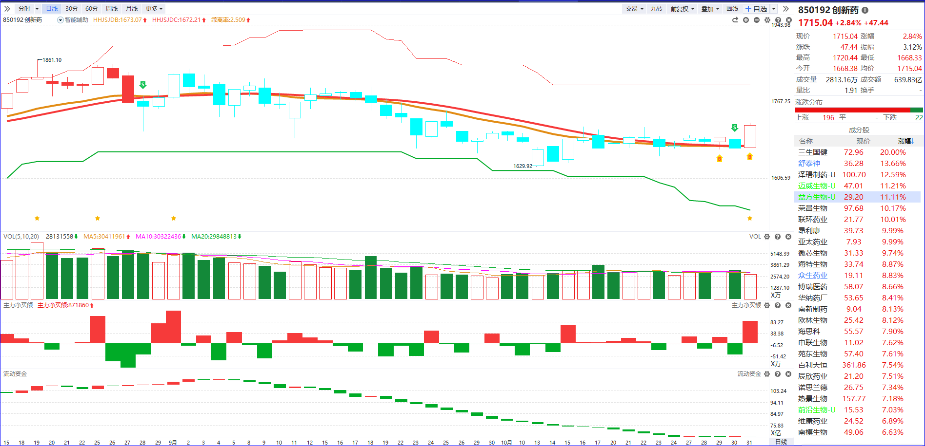 从软件信号看,近期创新药板块资金面呈现鲜明特征:流动资金持续处于翻绿为主的状态,但从主力资金行为来看,整体呈现红肥绿瘦格局,意味着主力资金在板块调整过程中仍有积极布局动作。从行情走势来看,板块尚未出现连续放量大涨行情,当前估值与位置仍处于相对低位区间。在当前高位科技板块阶段性分化、市场风格寻求切换的背景下,创新药板块凭借其低估值属性与资金布局迹象,已成为市场资金轮动过渡的重要潜在方向。对于后续走势,核心观测点在于流动资金能否快速实现由绿翻红,若资金面得到有效改善,结合板块此前B点信号出现后首次死叉回档的技术形态,这一阶段的布局将具备显著的短线性价比,可重点关注资金回流后的弹性机会。