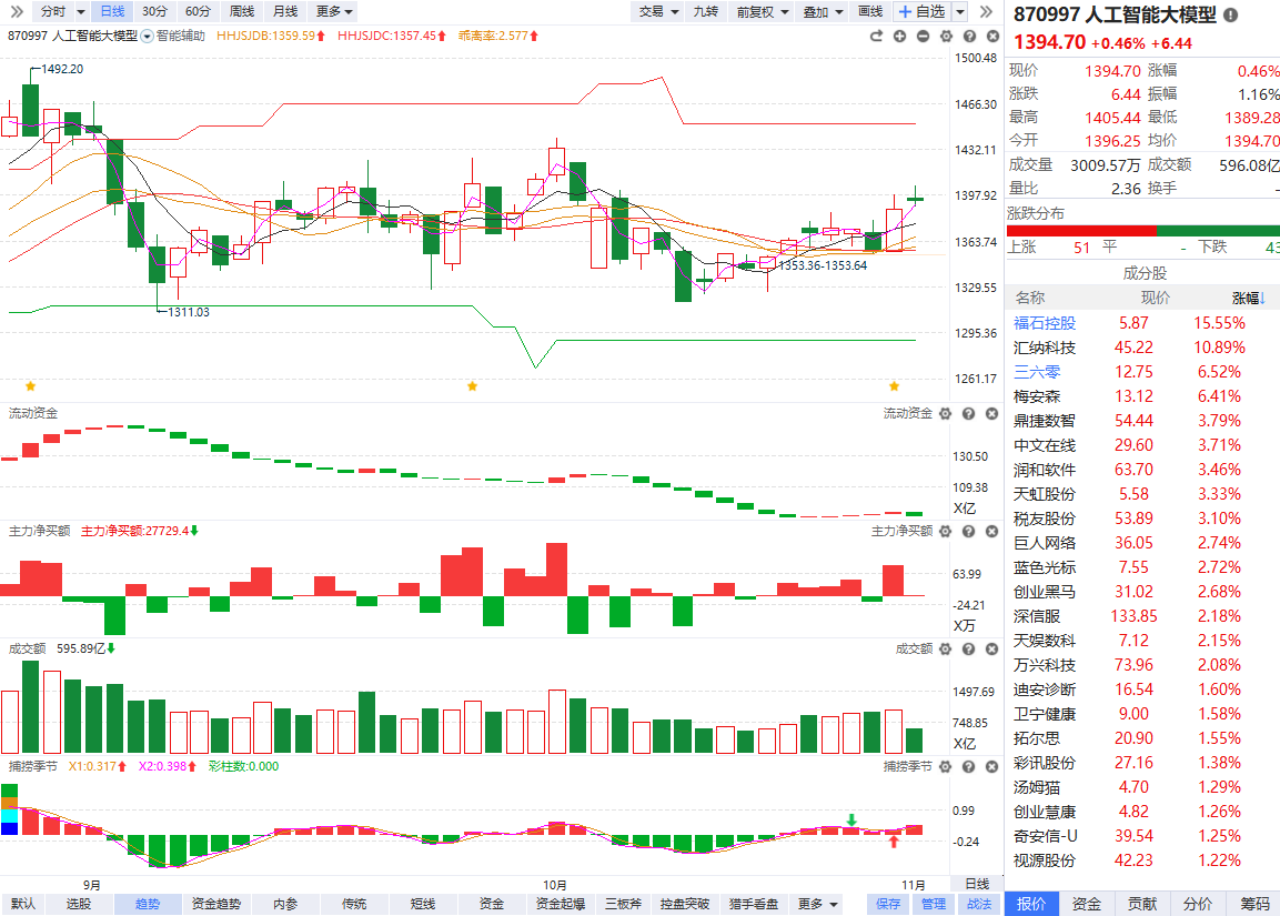 根据软件信号,板块近期流动资金持续翻红,主力净买额红肥绿瘦,高位AI硬件滞涨后,成为硬切软的高低切换方向。不过一般AI方向的炒作从硬件切换软件后,往往就接近阶段性炒作尾声了,需要注意反弹后再次分化的风险。