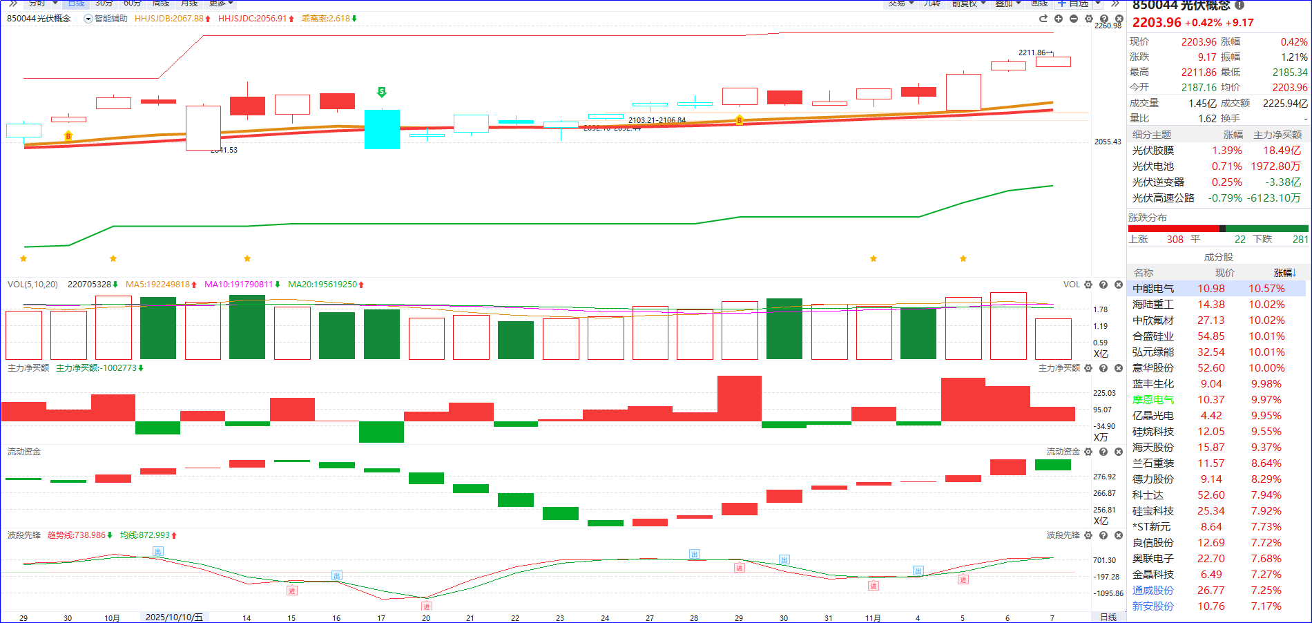 从软件信号看,光伏板块近期呈现流动资金持续翻红,叠加主力净买额红肥绿瘦的强势格局,资金做多意愿明确。在此推动下,板块刚完成对横盘箱体的突破,技术趋势正式由震荡转向上行,后续有望进入持续震荡上行通道。从操作窗口看,当板块迎来首次缩量回踩5日线或辅助线时,5日主力排序靠前的个股同步回档,将形成极佳的博弈节点--既消化短期获利盘,又承接趋势性买盘,安全边际与上涨弹性兼备。