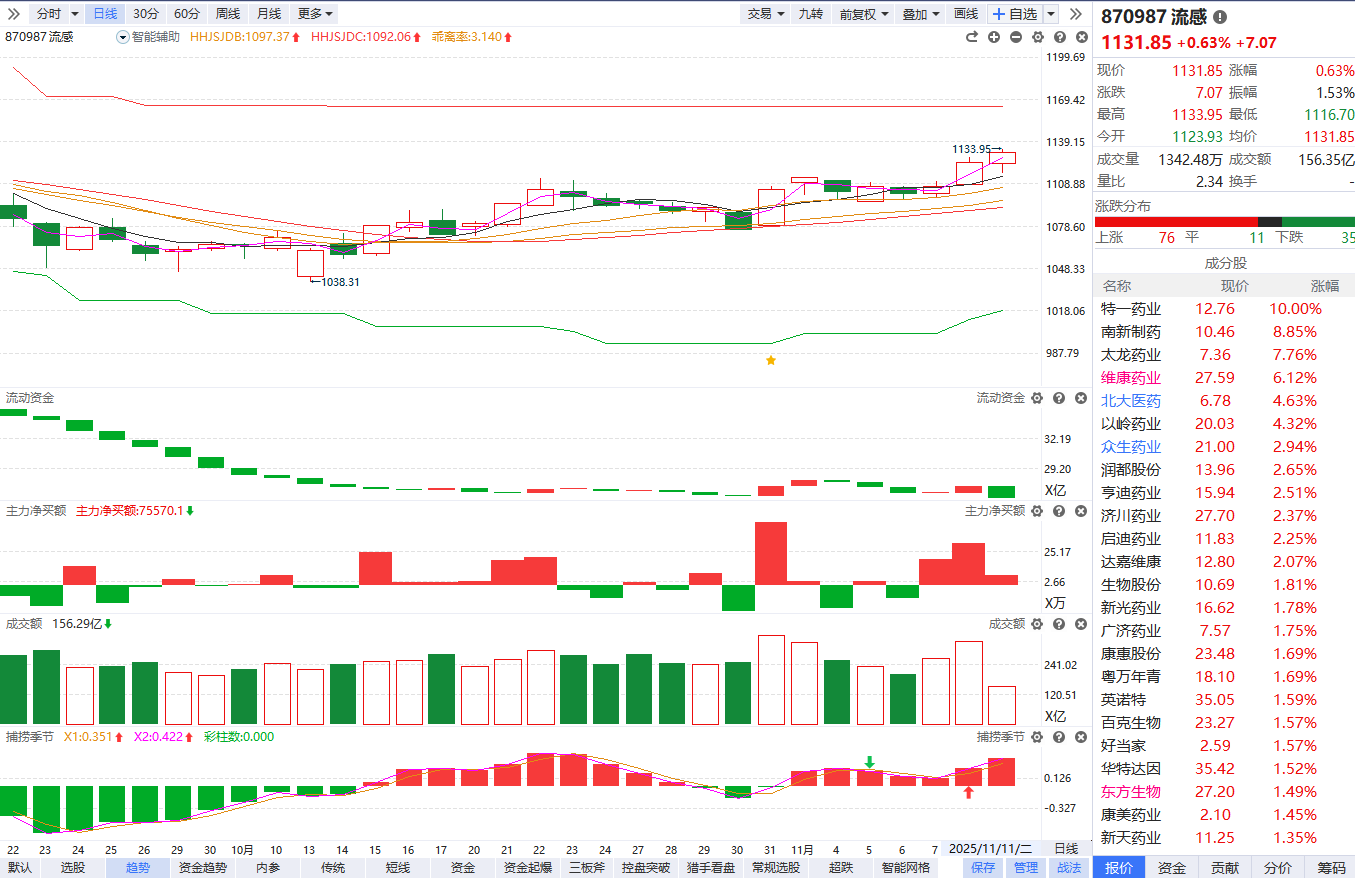 消息面上,11月10日,中国疾控中心介绍,当前我国总体流感活动属于上升阶段,甲型H3N2亚型占比超过95%,有少量甲型H1N1和乙型流感病毒同期流行,预计今年秋冬季我国流感疫情高峰可能出现在12月中下旬和1月初。