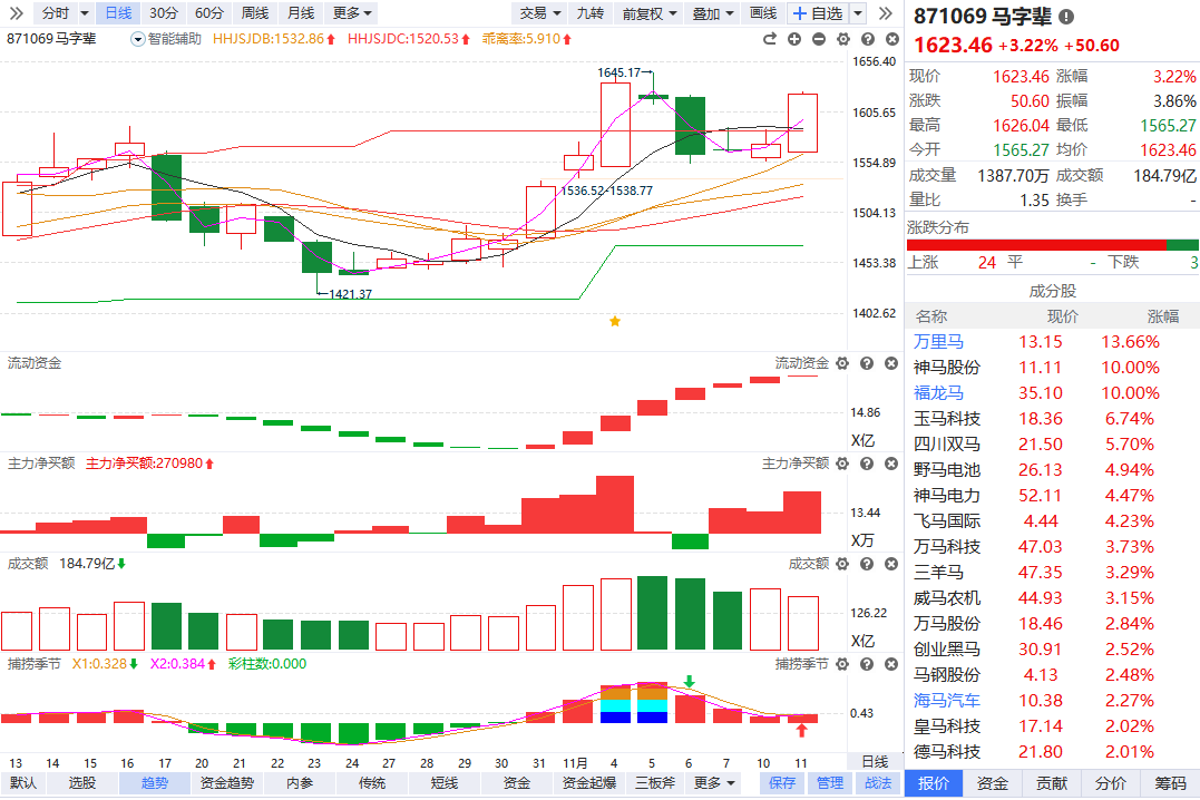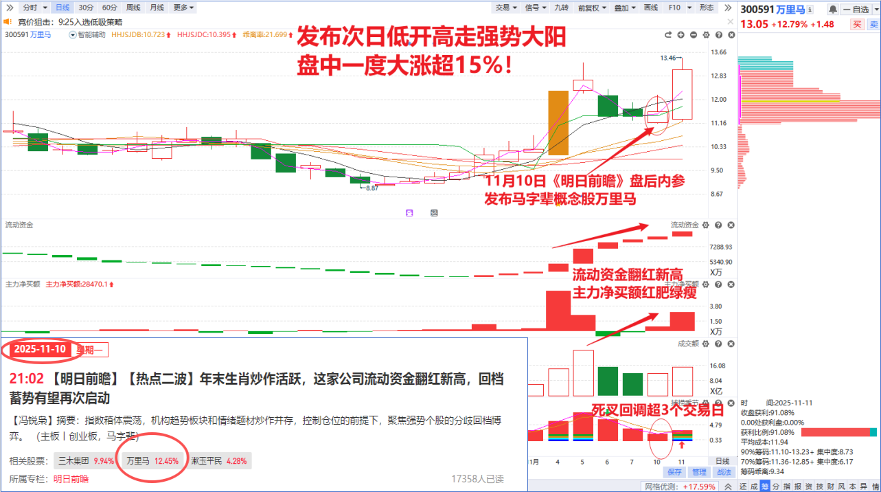 马字辈日内强势反包,咱们经传短线专栏《明日前瞻》也成功把握到板块的回档起爆节点,周一晚内参精准狙击马字辈概念股万里马,内参发布次日便低开高走盘中大涨超15%,让跟上策略的朋友在电风扇轮动市场中仍然逆市吃肉!想要狙击更多短线强势股的朋友,双十一活动全年最低价千万不要错过了
