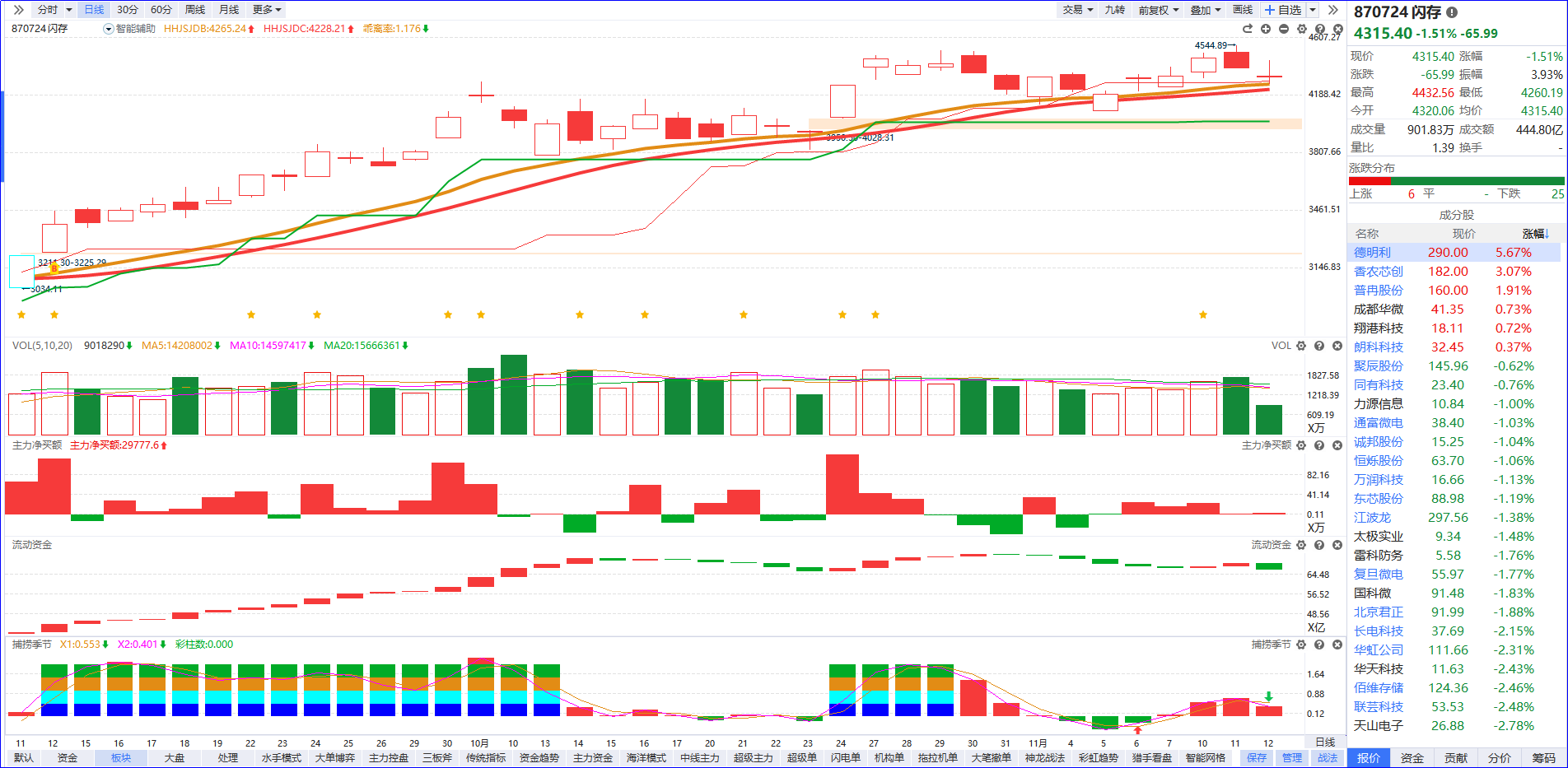 从软件信号看,存储板块近期流动资金开始走弱,主力净买额虽红肥绿瘦,但整体资金合力不足,板块阶段性上行动力减弱。板块此前回踩至辅助线附近后,出现探底回升的止跌信号,短期迎来反弹。不过需注意,当前板块捕捞季节已出现死叉信号,这意味着短期调整压力尚未完全释放。后续若想走出持续性行情,观察捕捞季节形成金叉,流动资金需明显翻红,以验证增量资金的进场意愿。若资金活跃度持续低迷,板块在短线震荡后,大概率会面临向下跌破辅助线支撑的风险,届时板块内部或出现再次分化,操作上需警惕持仓标的的调整压力,避免盲目抄底。