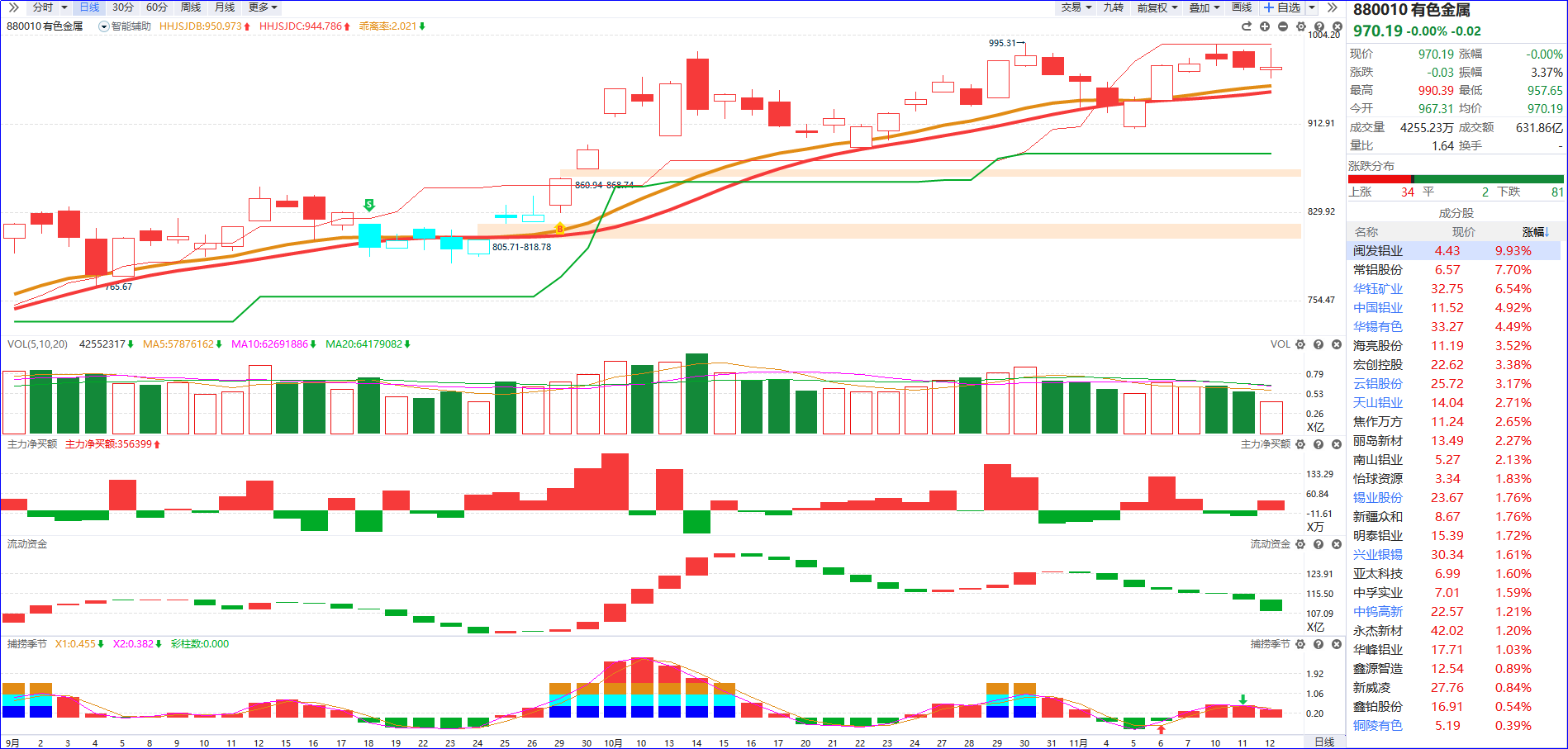 从软件信号看,近期有色金属板块的资金面呈流动资金持续翻绿,反映市场对该板块的短期关注度与增量资金介入意愿不足;尽管主力净买额呈现红肥绿瘦,但整体资金活跃度显著偏低,板块缺乏持续上行动力。板块已震荡调整3个交易日左右,当前正缩量回踩至辅助线附近。从短期走势来看,该位置具备一定支撑力度,因此存在小幅反弹的预期。但需警惕的是,反弹的持续性高度依赖资金面改善,若流动资金未能快速翻红、增量资金迟迟不愿进场承接,反弹行情大概率难以延续,甚至可能陷入震荡反复。基于此,若板块在流动资金翻绿的背景下出现反弹阳线,可逐步收缩仓位;或优先切换至当前市场中资金关注度更高、活跃度更强的题材板块,以规避该板块的不确定性风险。