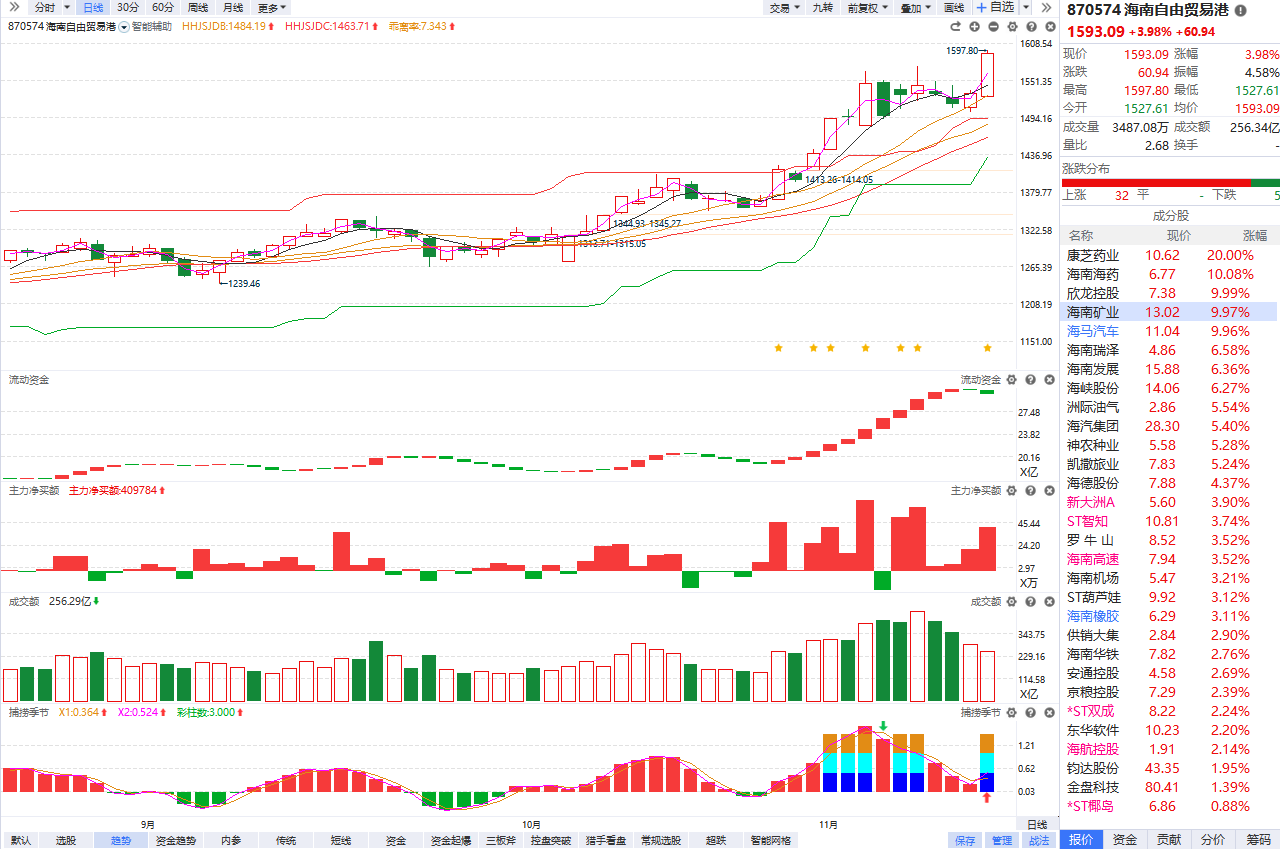 根据软件信号,板块近期流动资金持续翻红,主力净买额红肥绿瘦,缩量回踩5日线附近形成回档金叉,放量突破横盘平台,后续在资金的推动下有望延续震荡上行趋势,金叉初期缩量回踩5日线/60分钟回档节点,具备回档博弈性价比,在12月海南自贸港封关的利好正式落地之前,大概率还会有资金反复博弈。