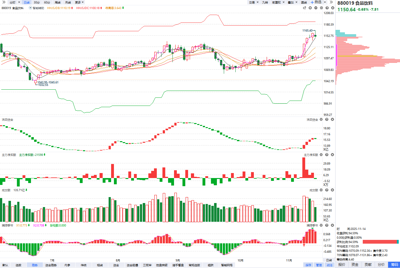 根据软件信号,板块近期流动资金持续翻红走强,主力净买额红肥无绿,资金强势背景下,突破平台后走出上升趋势。近期死叉震荡缩量回调,死叉4个交易日后在均线支撑附近走出止跌反弹阳线,如果资金继续翻红流入,有望形成回档金叉的反弹波段,可以积极关注资金和趋势维持强势的回档个股。