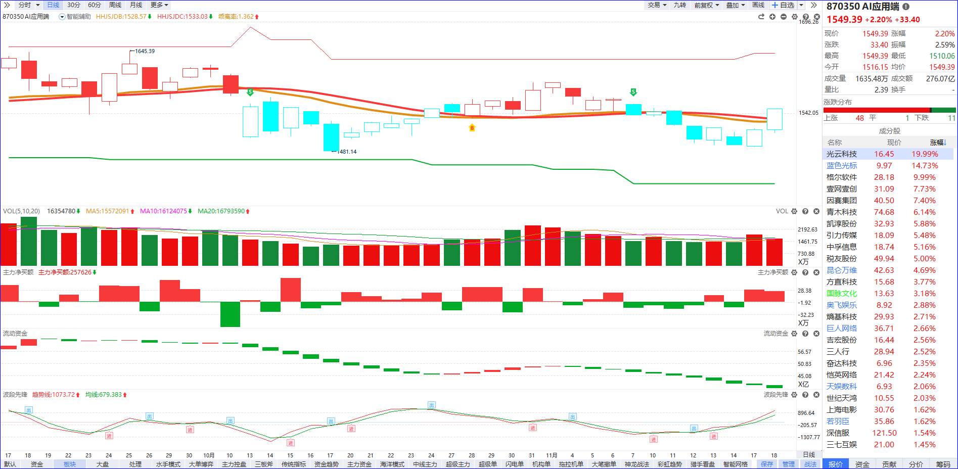从软件信号看,AI 应用端近期资金面呈现分化特征:一方面,流动资金持续翻绿,表明板块整体资金活跃度与市场吸引力仍在下降,尚未形成板块级别的资金共识;另一方面,主力净买额连续翻红,推动板块反弹两日并重回智能辅助线之上,且局部已涌现出一批资金红肥绿瘦的领涨个股,显示板块内部存在结构性机会。后续需重点观察板块级流动资金能否在领涨人气股的带动下实现翻红:若能完成资金面修复,则板块或具备进一步反弹空间;若流动资金持续疲软,仅维持局部个股活跃,则需收缩战线,聚焦5日主力资金排序靠前+个股流动资金翻红的标的,通过精选个股规避板块整体弱势风险,把握资金集中流向的结构性机会。
