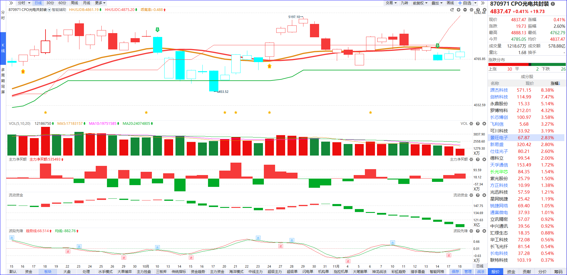 从软件信号看,当前CPO板块资金面呈现流动资金指标持续翻绿,整体动能处于持续走弱态势。从短期走势来看,板块若出现反抽行情,更多是市场在高位题材分歧阶段,资金轮动至超跌板块的阶段性行为,同时叠加对英伟达财报利好的预期博弈,暂时不确定有趋势性反转信号。尽管产业逻辑清晰的核心标的更受资金偏好,具备相对抗跌性,但需警惕:若后续缺乏增量资金进场形成有效承接,板块反抽行情仍不具备强持续性。操作层面建议回避急涨追高,避免陷入短期波动风险,耐心等待资金面(流动资金止跌翻红)与技术趋势(如重回智能辅助线上方、形成量价共振)同步修复后的明确拐点,再择机布局。