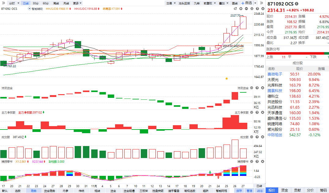 消息面上,山西证券研报称,北美五大CSP2025年三季度资本开支同比增速均超50%,英伟达预计2026/2027年CSPCAPEX有望达到5490亿、6320亿美元,带动1.6T光模块需求上调。