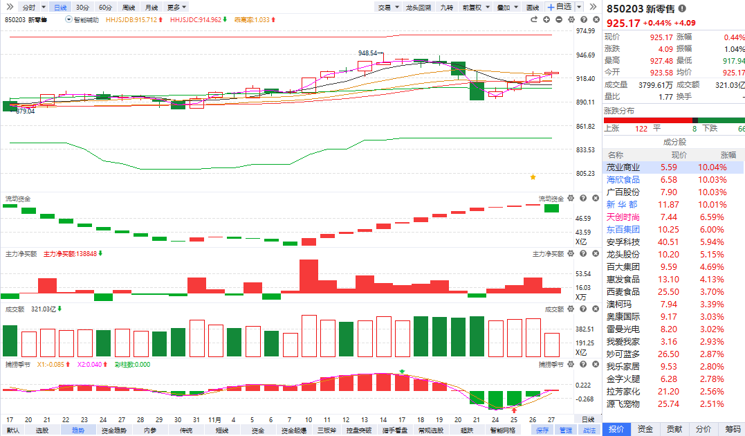 零售概念反复活跃,茂业商业3连板,广百股份涨停,东百集团、居然之家、合百集团、三江购物、国光连锁跟涨。
