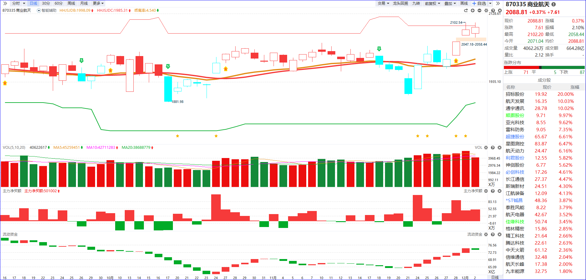 从软件信号看,近期商业航天流动资金持续翻红,,净买额呈现红肥绿瘦,做多动能始终占据主导,板块量能配合下成功突破前期横盘整理平台,突破之后板块首次迎来分歧调整,随即快速触发强回流修复行情,并未出现趋势逆转信号,当前整体上升趋势依旧保持完整且延续性良好。对于后续操作,可关注两方面:其一,板块内核心人气股需规避跌停级别的亏钱效应,这是趋势延续的重要前提;其二,若板块在上涨过程中出现缩量回调,当股价回踩至5日均线附近区域时,凭借板块当前的活跃度与资金关注度,大概率会吸引短线活跃资金进场博弈,形成阶段性低吸机会。