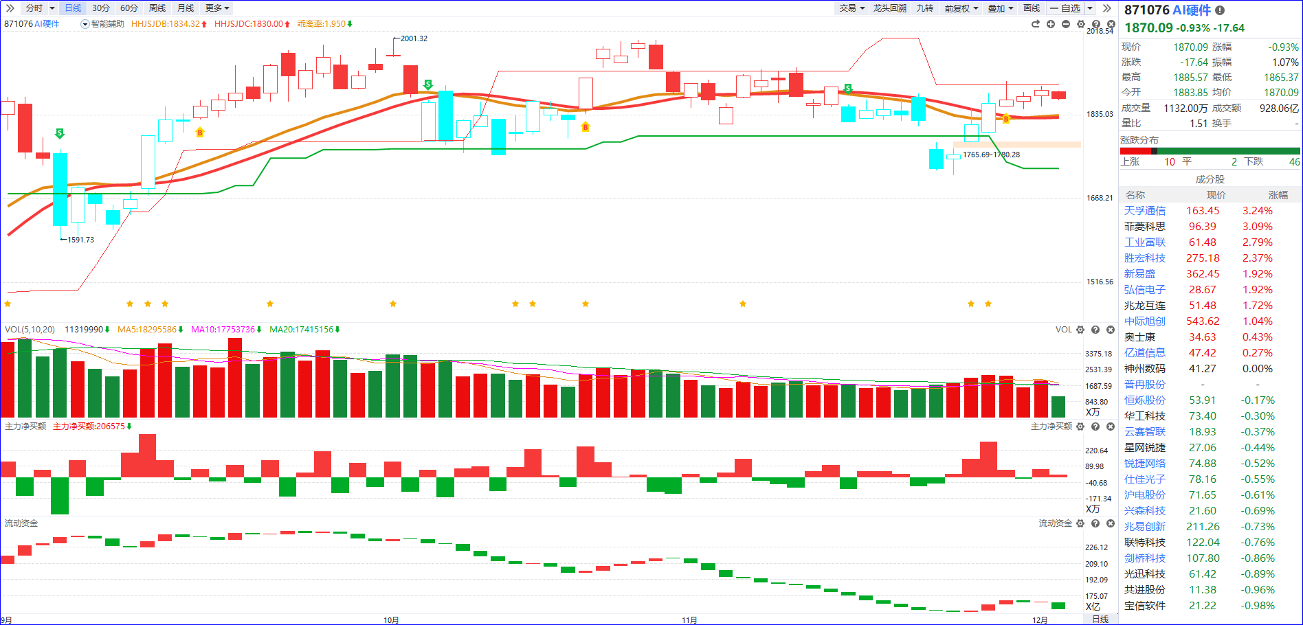 从软件信号看,近期AI硬件流动资金翻红为主,主力净买额红肥绿瘦特征显著,资金面强势支撑下,板块在智能辅助线附近震荡,核心在于产业龙头中际旭创和新易盛等延续赚钱效应,甚至能再度新高,届时板块流动资金维持持续翻红,后续重点聚焦两类标的:一是5日主力资金排序靠前的个股,二是叠加流动资金持续翻红或主力控盘度稳步递增的标的,可耐心等待板块缩量回档时机,把握回调后的高性价比布局节点。
