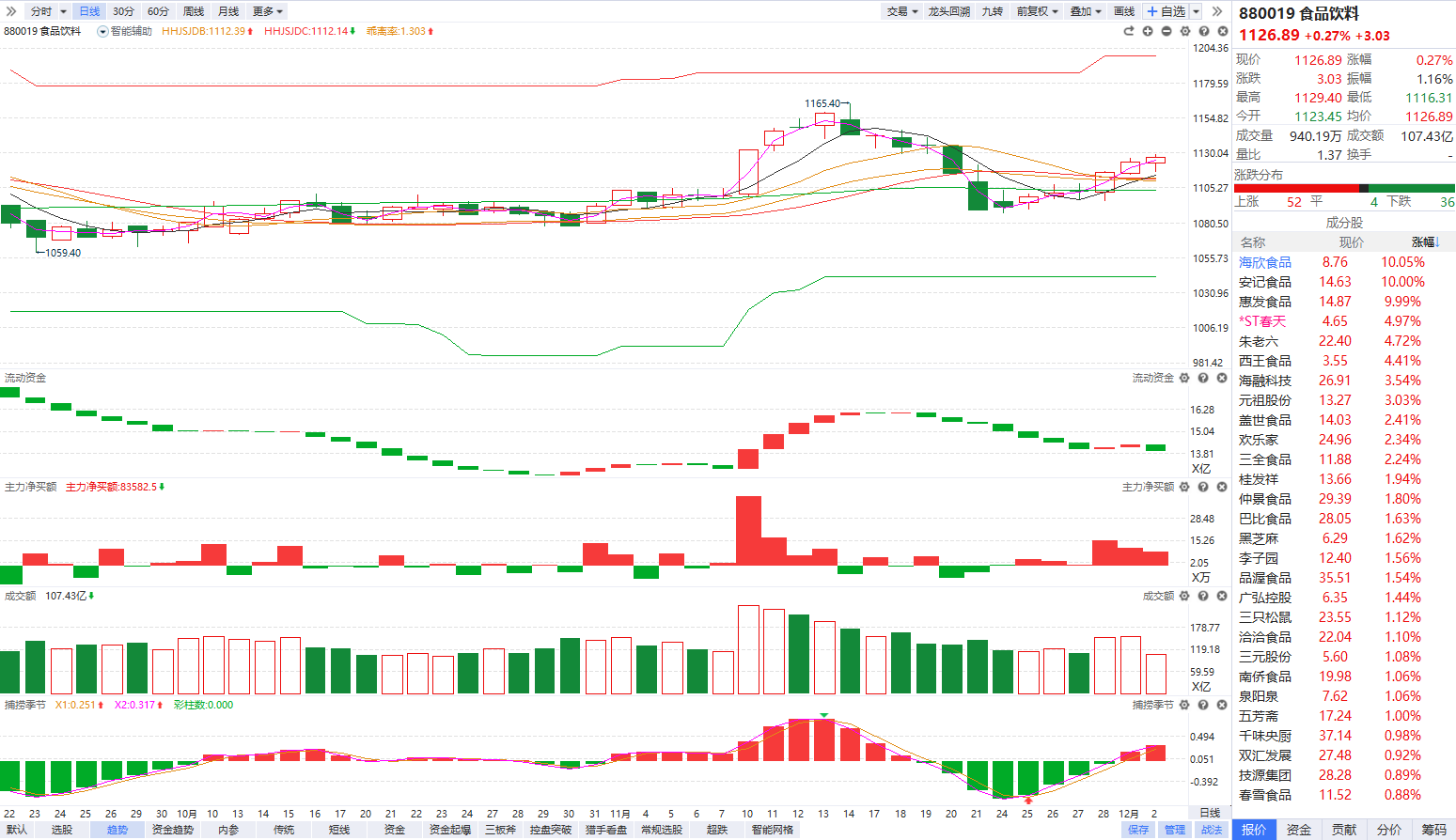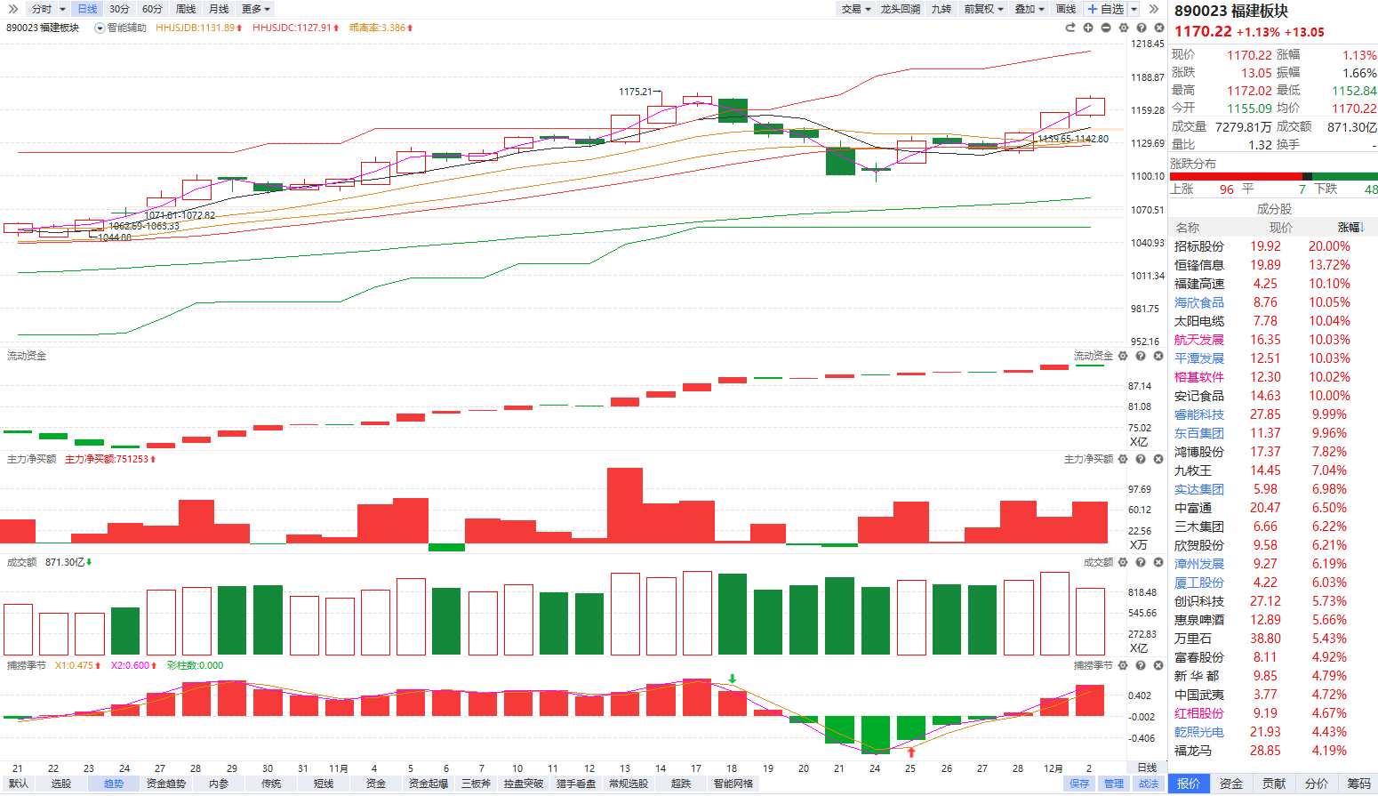 根据软件信号,板块近期流动资金持续翻红走强,主力净买额红肥绿瘦,金叉站上辅助线后温和放量上涨,资金和趋势走强。目前已经金叉反弹多个交易日,短线再度急涨后可能出现内部分化,如果资金继续翻红强势,站上辅助线后的首次回档,死叉震荡3-4个交易日具备短线反弹预期