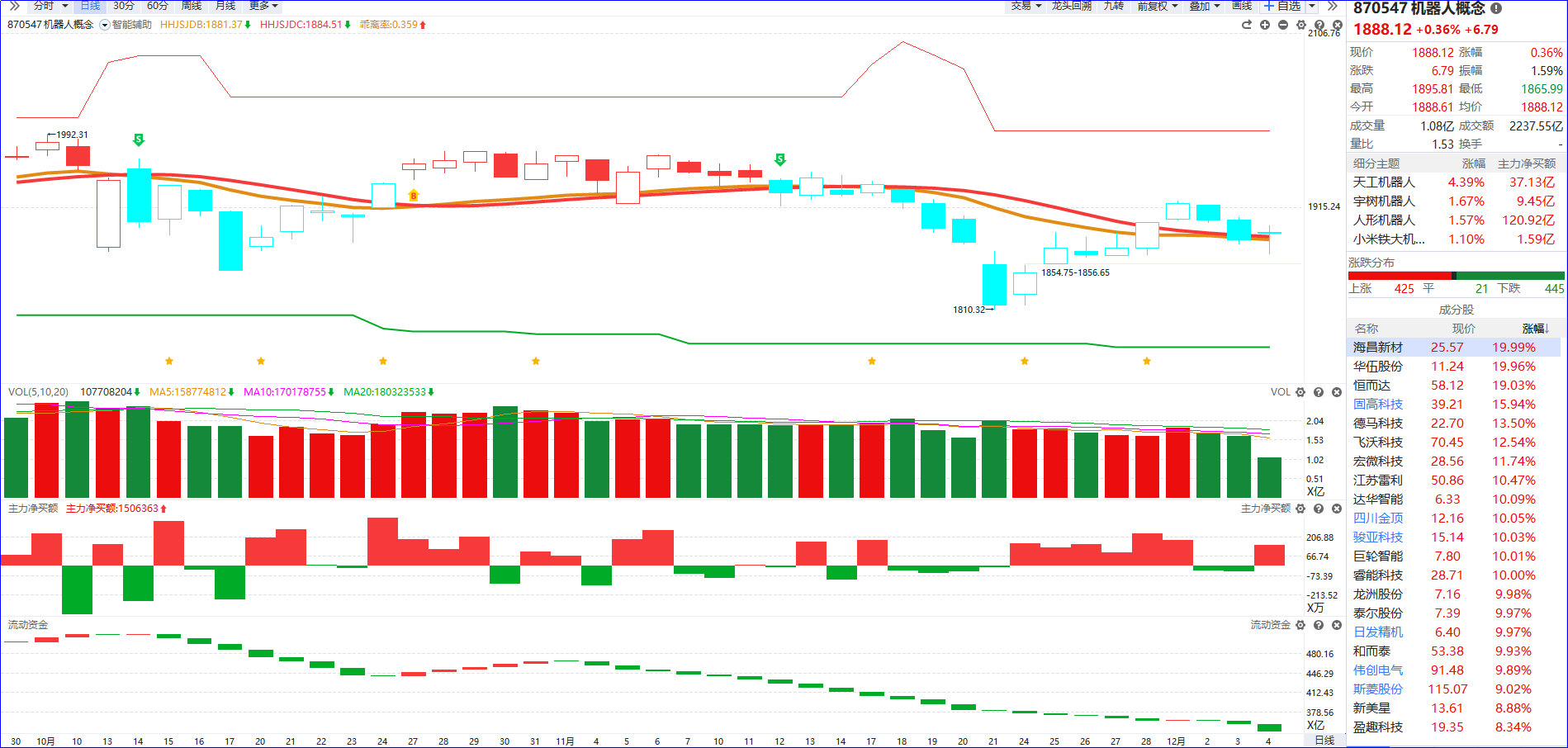 从软件信号看,近期机器人概念流动资金持续翻绿,短期出现的反弹行情,更多是受消息面刺激引发的局部轮动效应,板块整体尚未形成具备持续性的机会。后续若流动资金无法快速转为翻红,意味着市场缺乏增量资金进场承接前期积累的获利盘,在此背景下,板块首次回档后的反弹行情,很容易因资金支撑不足再度陷入分化回落。建议保持耐心,等待两大关键信号确认:一是流动资金明确翻红,增量资金持续进场;二是板块趋势出现实质性走强(如突破关键压力位、形成明确上升结构),待资金与趋势形成共振后,再把握更具确定性的布局机会。