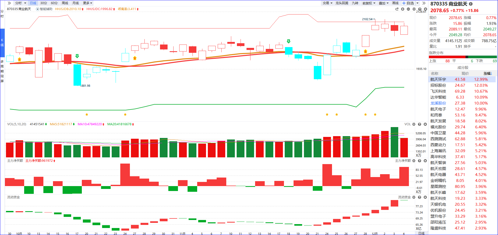 从软件信号看,近期商业航天流动资金持续翻红,净买额呈现红肥绿瘦,突破前期横盘整理平台后转震荡,上午迎来加强。对于后续操作,可关注两方面:其一,板块内核心人气股触发亏钱效应则作为短线离场信号;其二,聚焦流动资金持续翻红的标的做博弈。
