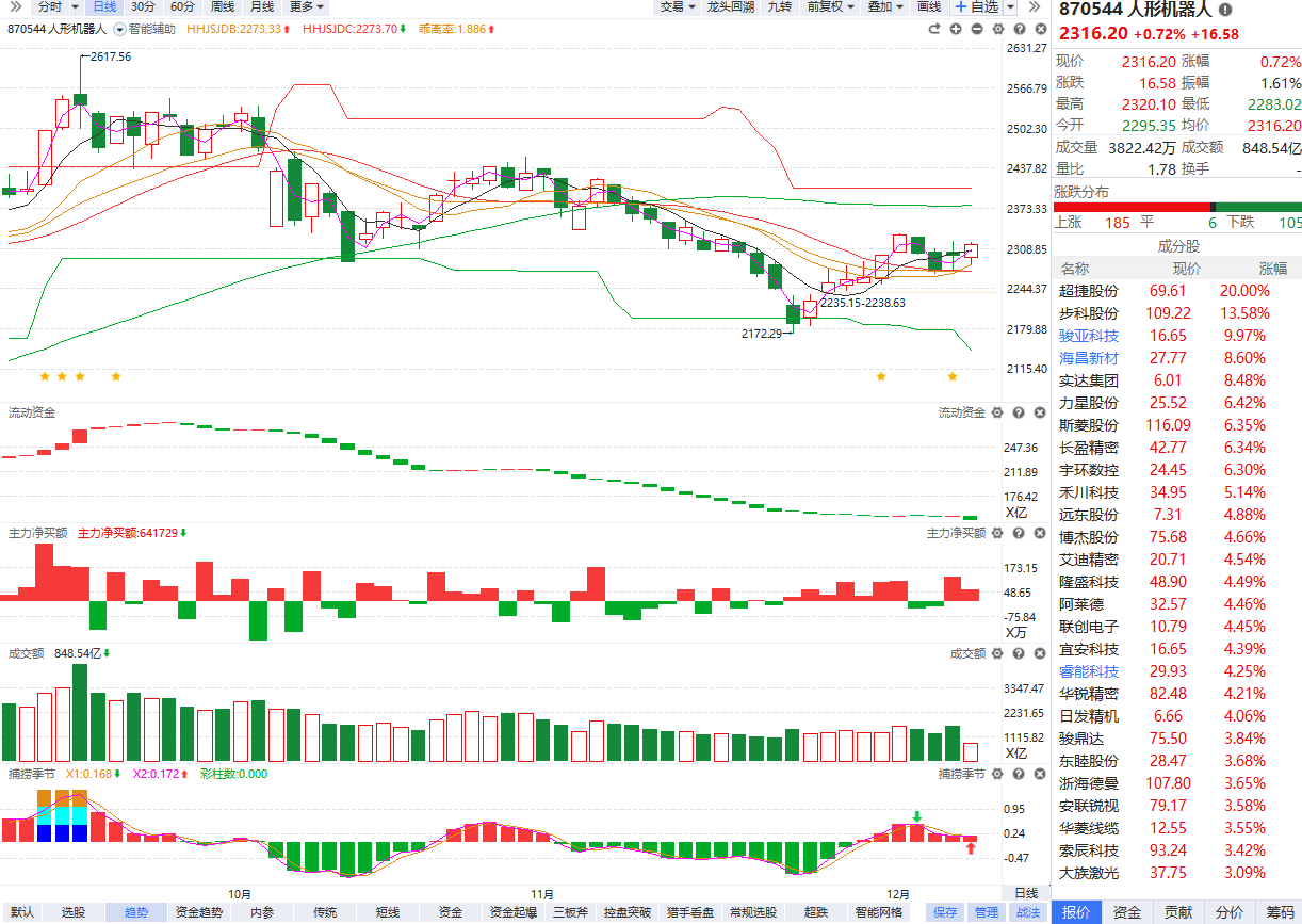 根据软件信号,板块近期流动资金持续翻红新高,主力净买额红肥无绿,放量突破横盘平台后进入上升趋势,资金和趋势强势背景下,回档金叉再度阶段新高,确立趋势主升形态,后续如果资金持续翻红走强,缩量回踩5日线(60分钟)回档的节点,只要未出现跌停板的亏钱效应,都可以积极关注板块内人气股的分歧低吸博弈。