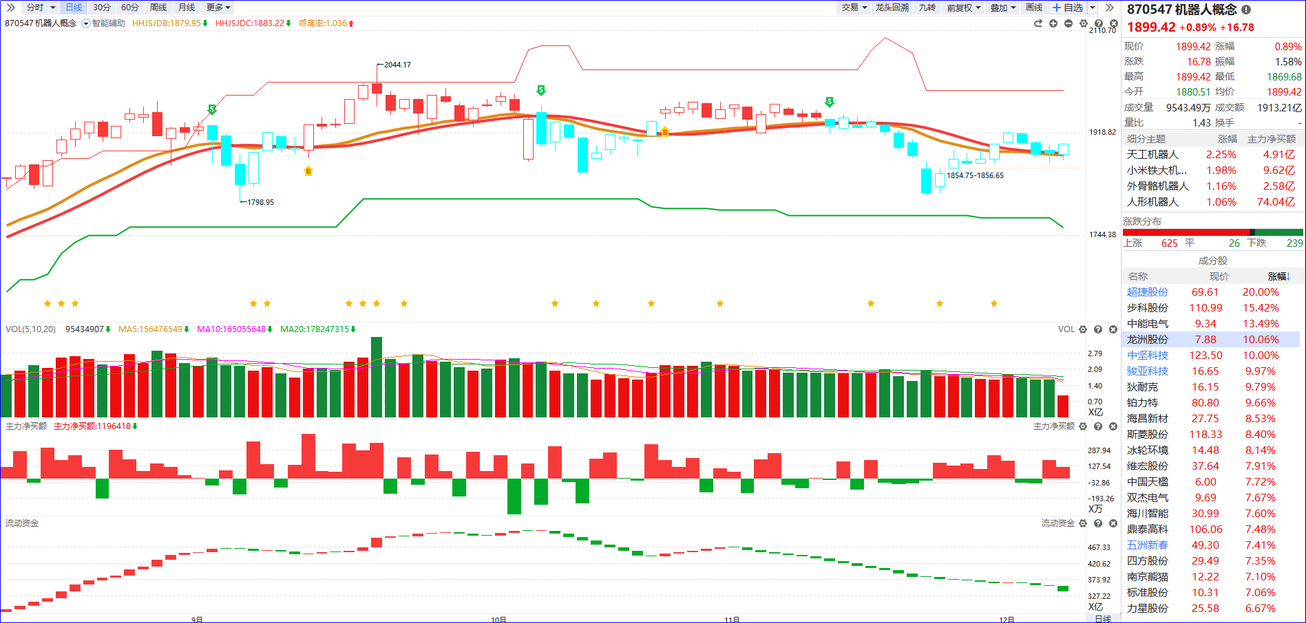 从软件信号看,近期机器人概念流动资金持续翻绿,围绕智能辅助线附近出现反弹,更多是位置相对较低且受消息面刺激引发的局部轮动效应,板块整体尚未形成具备持续性的机会。后续若流动资金无法快速转为翻红,板块首次回档后的反弹行情,很容易因资金支撑不足再度陷入分化回落。保持耐心,等待板块流动资金明确翻红,增量资金持续进场,再把握更具确定性的布局机会。