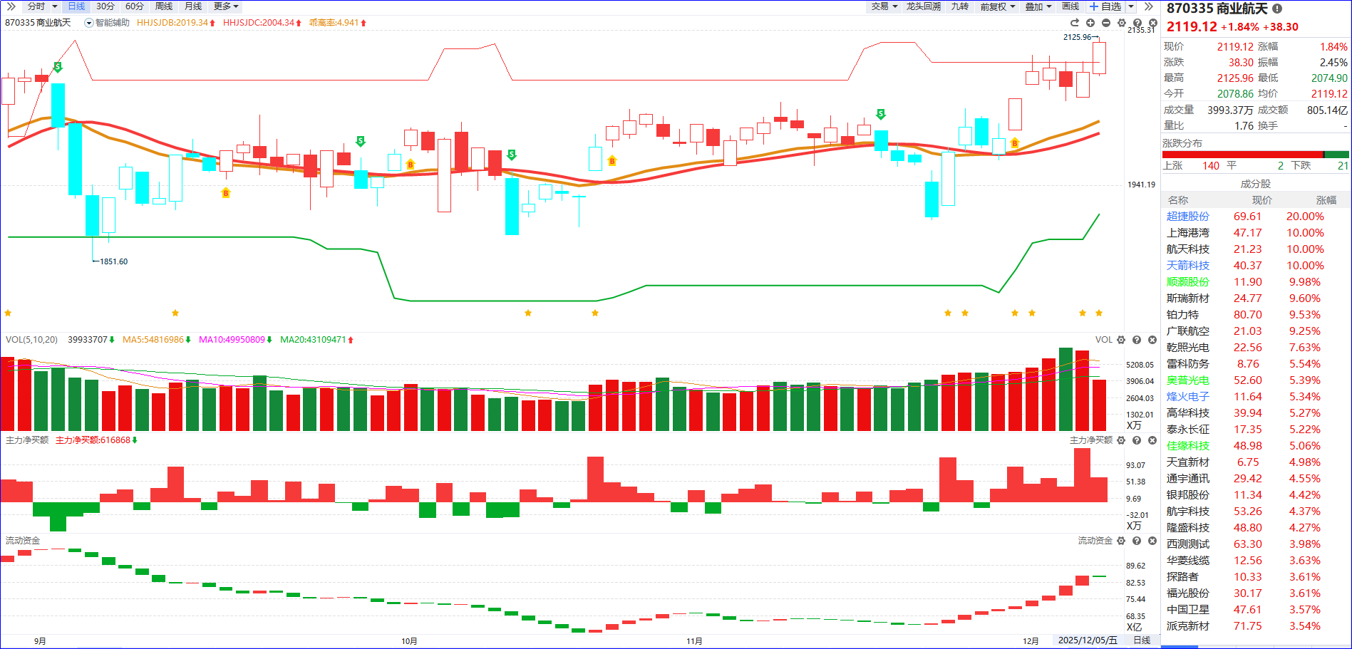 从软件信号看,近期商业航天流动资金持续翻红,净买额呈现红肥绿瘦,突破前期横盘整理平台震荡转拉升,走出阶段新高,今日板块内部呈现高低切换。对于后续操作,可关注两方面:其一,板块内核心人气股(航天发展)触发亏钱效应则作为短线离场信号;其二,聚焦流动资金持续翻红的标的做博弈。