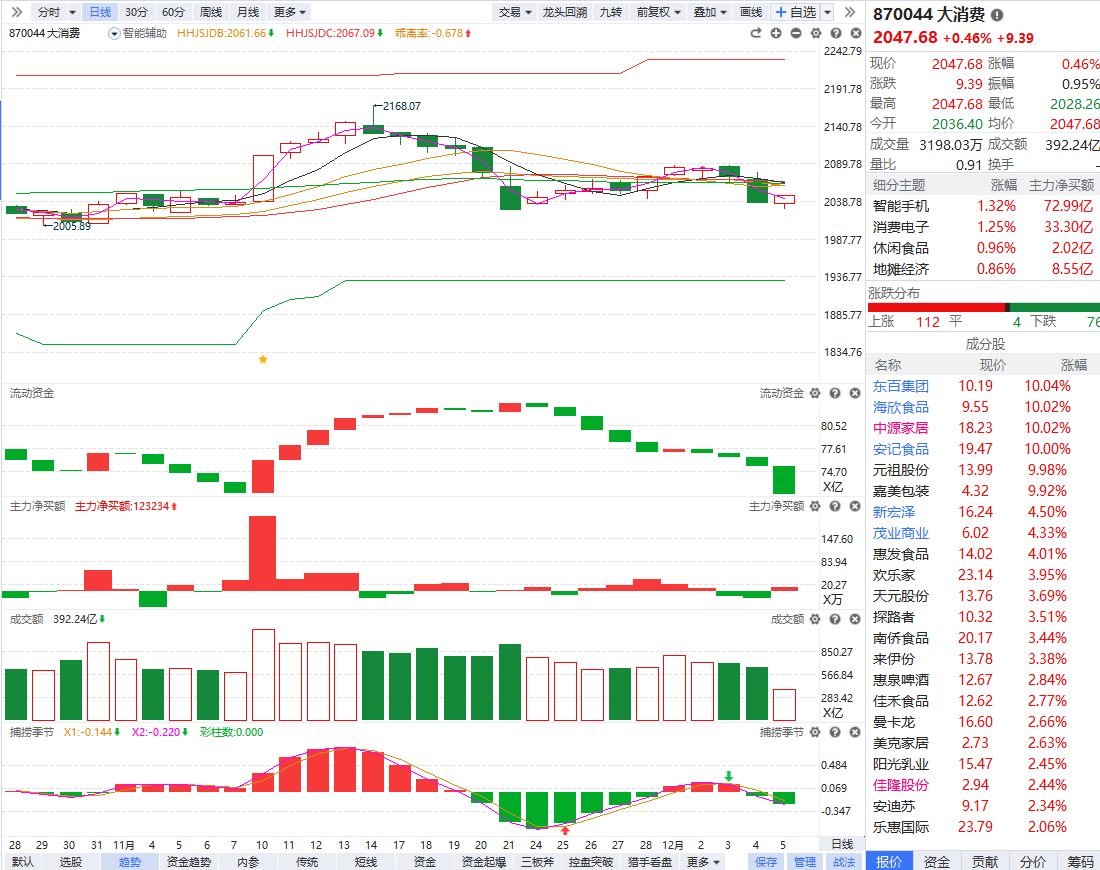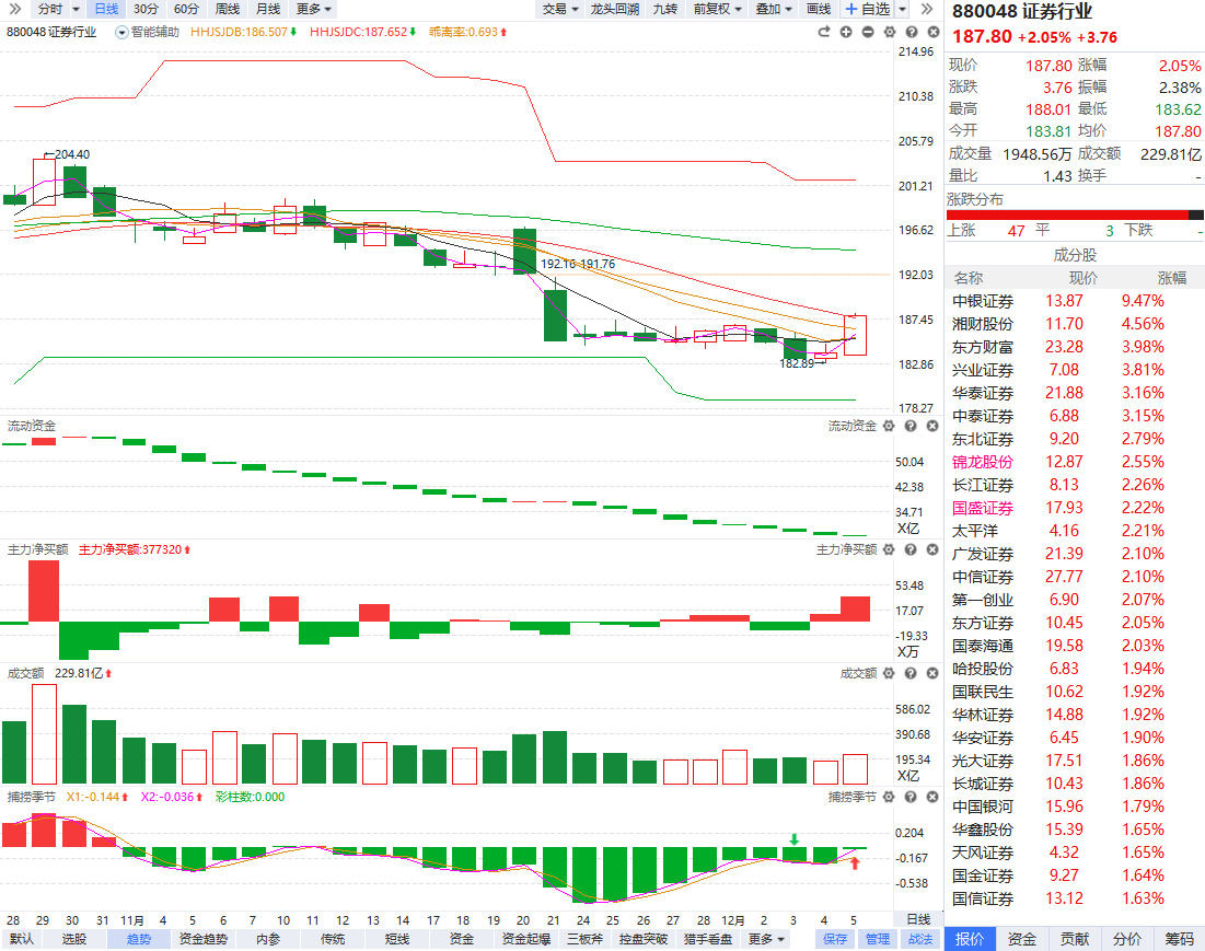根据软件信号,板块近期流动资金持续翻绿,缩量跌破辅助线后探底回升反弹,短期和11月21日的低点形成双底结构,后续留意流动资金能否快速翻红并带动板块站上辅助线,如果资金和趋势转强,有望形成阶段性反弹走势。