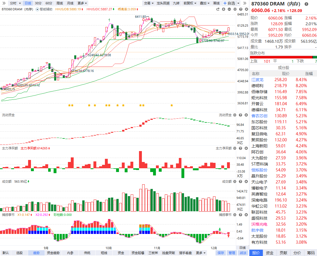 根据软件信号,板块近期流动资金持续翻绿新低,主力净买额红肥绿瘦,出现主力资金进场但整体资金活跃度较低,还未形成市场合力。回档金叉反弹到前期11月20日的起跌点压力附近,如果资金不能快速翻红,放量解放前期套牢盘,就还容易再次分化,注意回避高位冲高追涨。