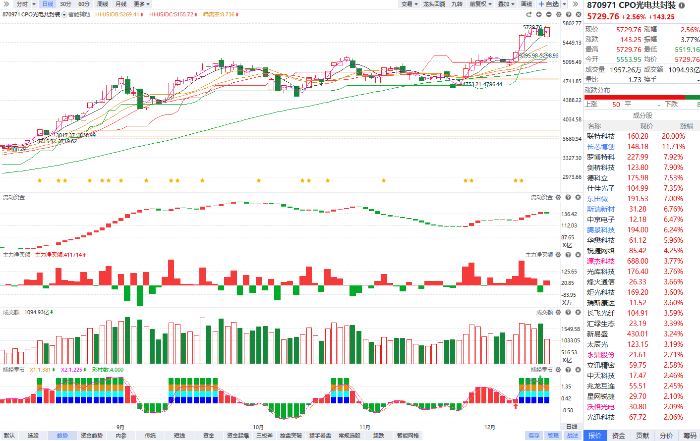 CPO概念盘初拉升,德科立、东田微涨超7%,均续创历史新高,富信科技、联特科技涨超10%,源杰科技、腾景科技、新易盛涨幅靠前。
