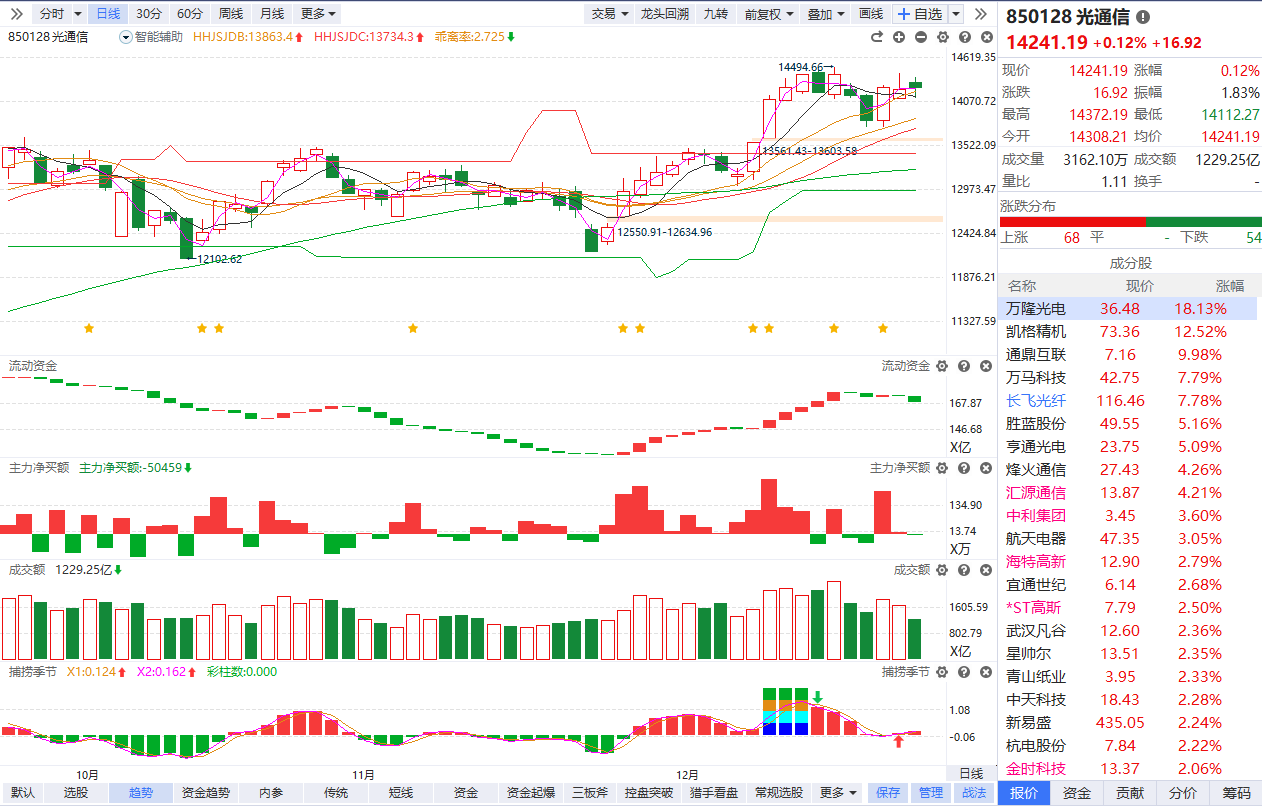 午后光通信概念震荡走强,理工光科20cm涨停,此前通鼎互联3天2板,长飞光纤、烽火通信、亨通光电、胜蓝股份跟涨。