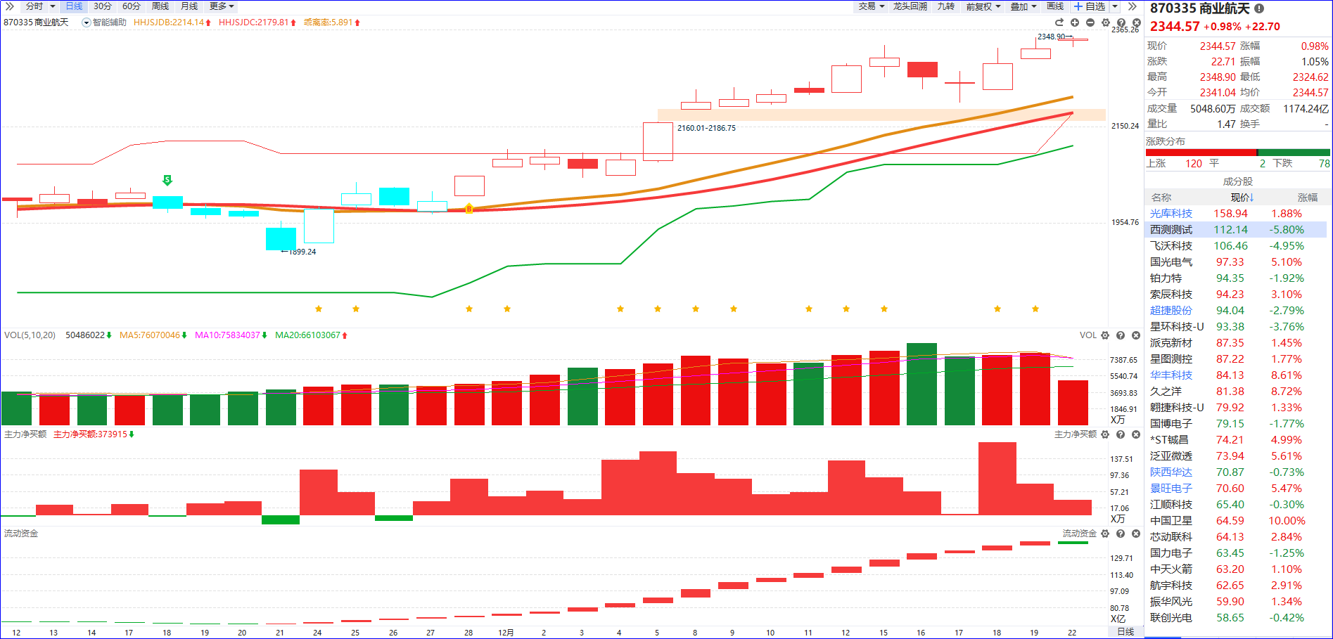 从软件信号看,商业航天近期流动资金持续翻红,主力净买额呈现红肥绿瘦,在资金合力推动下,已构筑沿5日均线震荡上行的明确强趋势。当前板块已连续反弹两个交易日,量能持续性成为关键看点:若后续量能无法跟进放大,需警惕获利盘分歧加剧的风险,建议耐心等待缩量回踩后的高性价比博弈节点。