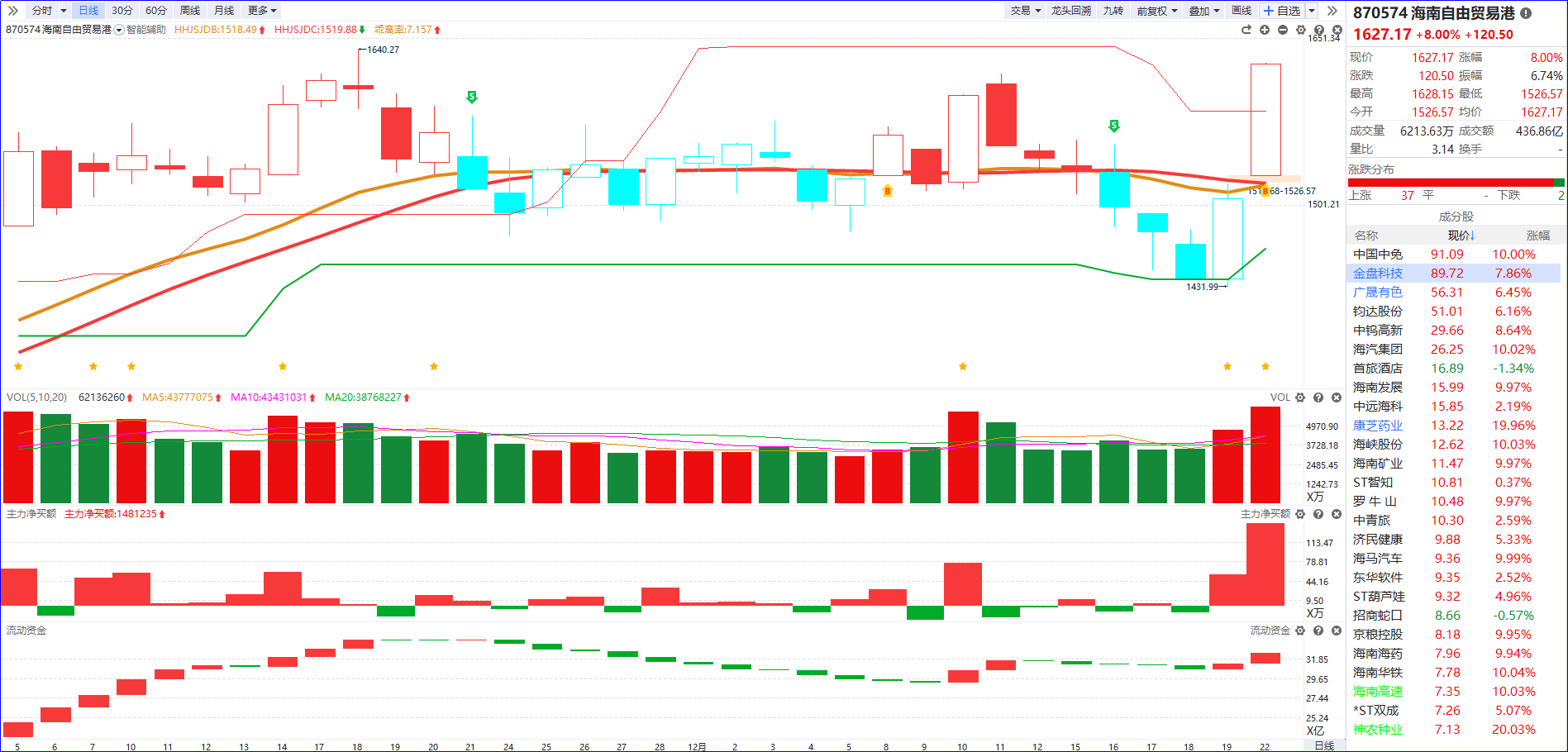 从软件信号看,海南概念近期流动资金转强翻红,主力净买额呈现红肥绿瘦,在消息面催化下实现放量突破前期高点。不过,板块连续两个交易日以大阳线强势上攻,短线获利盘已显著累积,急涨后极易触发内部分化。操作层面需坚守去弱留强原则,规避高潮次日的追涨接力行为,耐心等待分歧回档后的博弈机会。