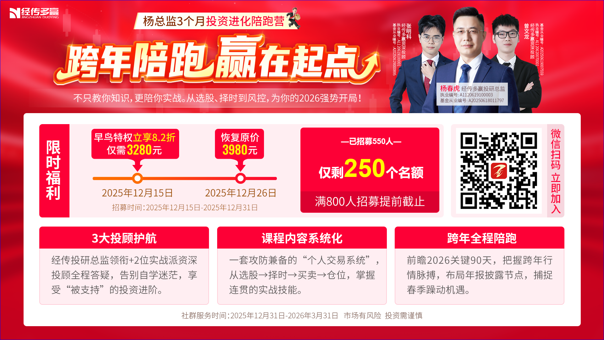 杨总监领衔+2位实战派投顾全程答疑,传授您一套攻防兼备的“个人交易系统”,前瞻2026年关键90天,把握年报、春季躁动机遇!
