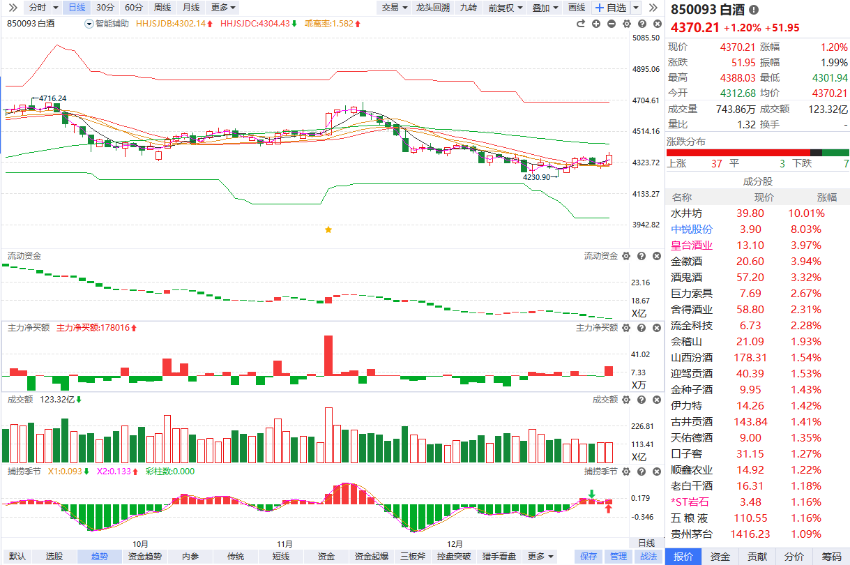 根据软件信号,板块近期流动资金持续翻红,主力净买额红肥绿瘦,放量突破前期横盘平台后技术形态转强,有望启动新一轮上行趋势。只要资金继续维持强势,缩量回踩5日线的60分钟回档节点,可以积极关注资金强势个股的回档金叉博弈。