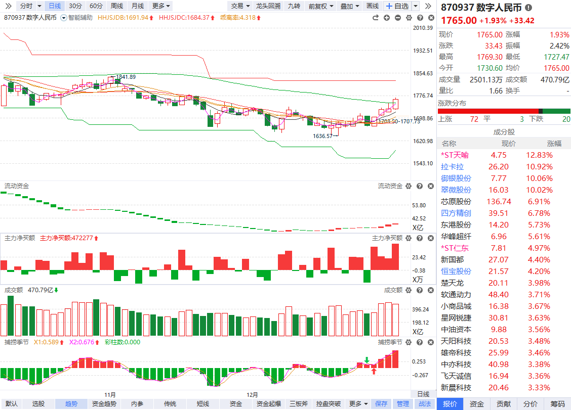 数字货币概念快速拉升,拉卡拉涨超12%,四方精创、翠微股份、恒宝股份、楚天龙跟涨。