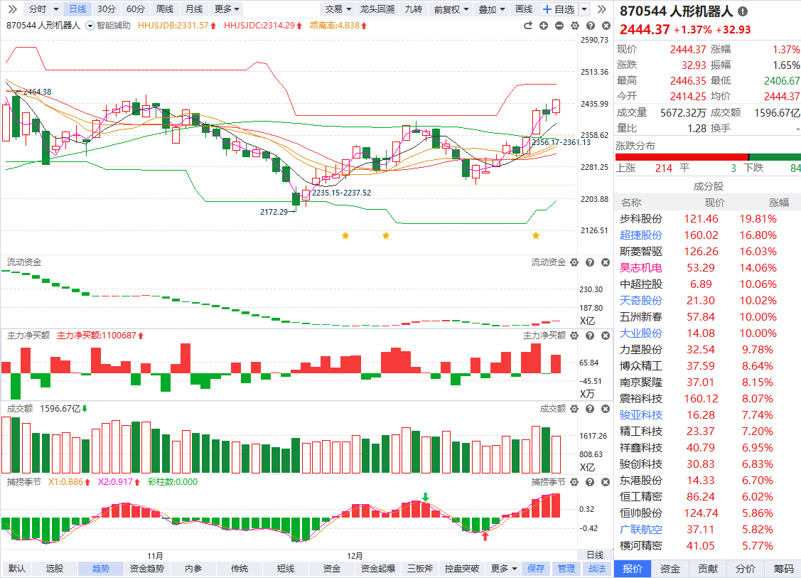 根据软件信号,板块近期流动资金持续翻红,主力净买额红肥绿瘦,资金强势背景下放量站上辅助线,熊线上移形成趋势启动。目前板块仍处在相对低位,首次缩量回档具备较强的短线性价比,可以积极关注刚刚突破60日线的资金强势个股,短线能否出现回档博弈机会。