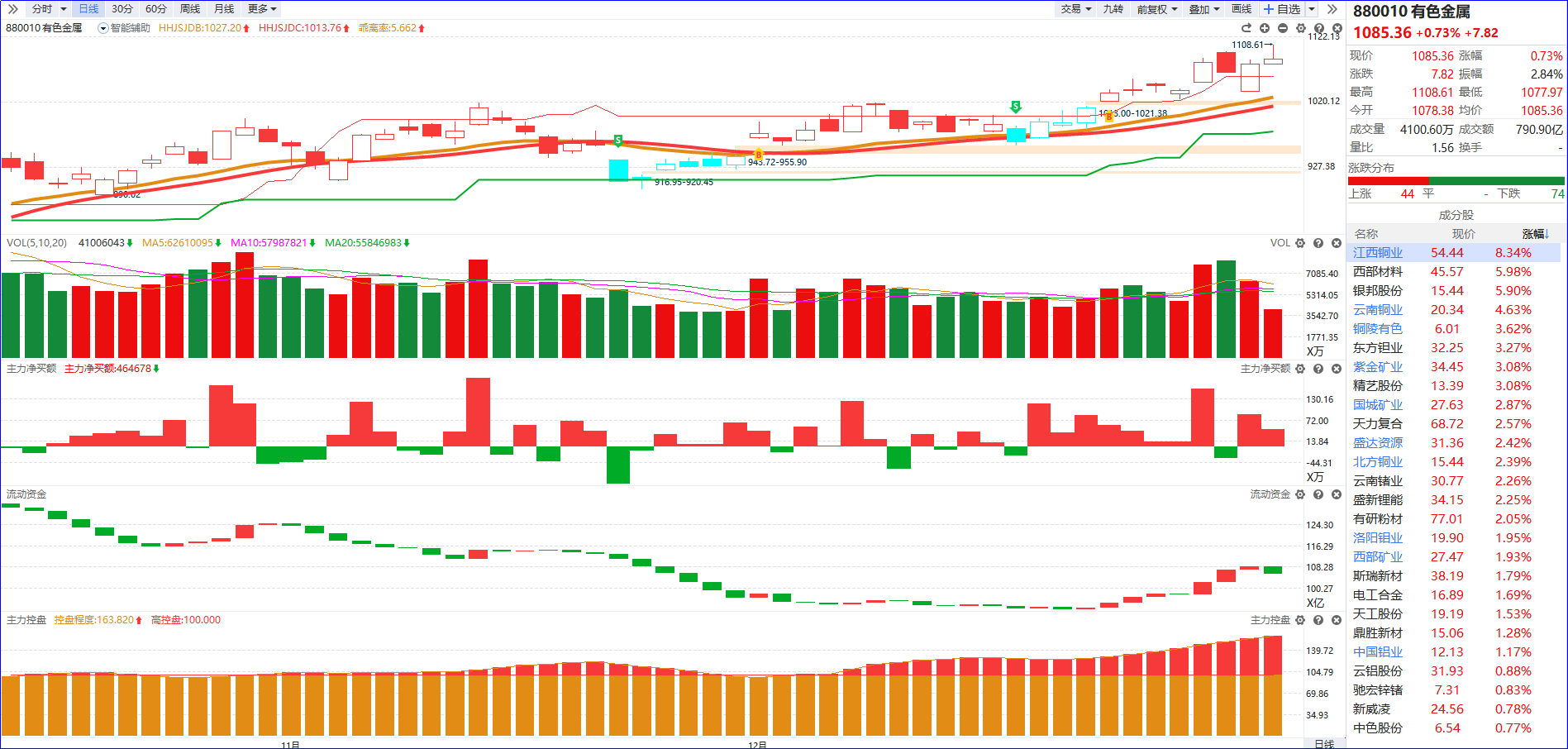 从软件信号看,有色板块近期流动资金维持持续翻红,主力净买额呈现红肥绿瘦,资金承接力度稳固。今日板块股价一度创下阶段新高,整体趋势与资金面均朝着向好方向发展。值得重点关注的是,有色板块当前已是主力高控盘的方向,板块内部不断涌现主力高控盘、筹码锁仓充分且股价创新高的标的。对于这类高控盘个股,只要未出现放量大阴线的形态,就尚未释放明确风险信号,可继续跟踪关注。