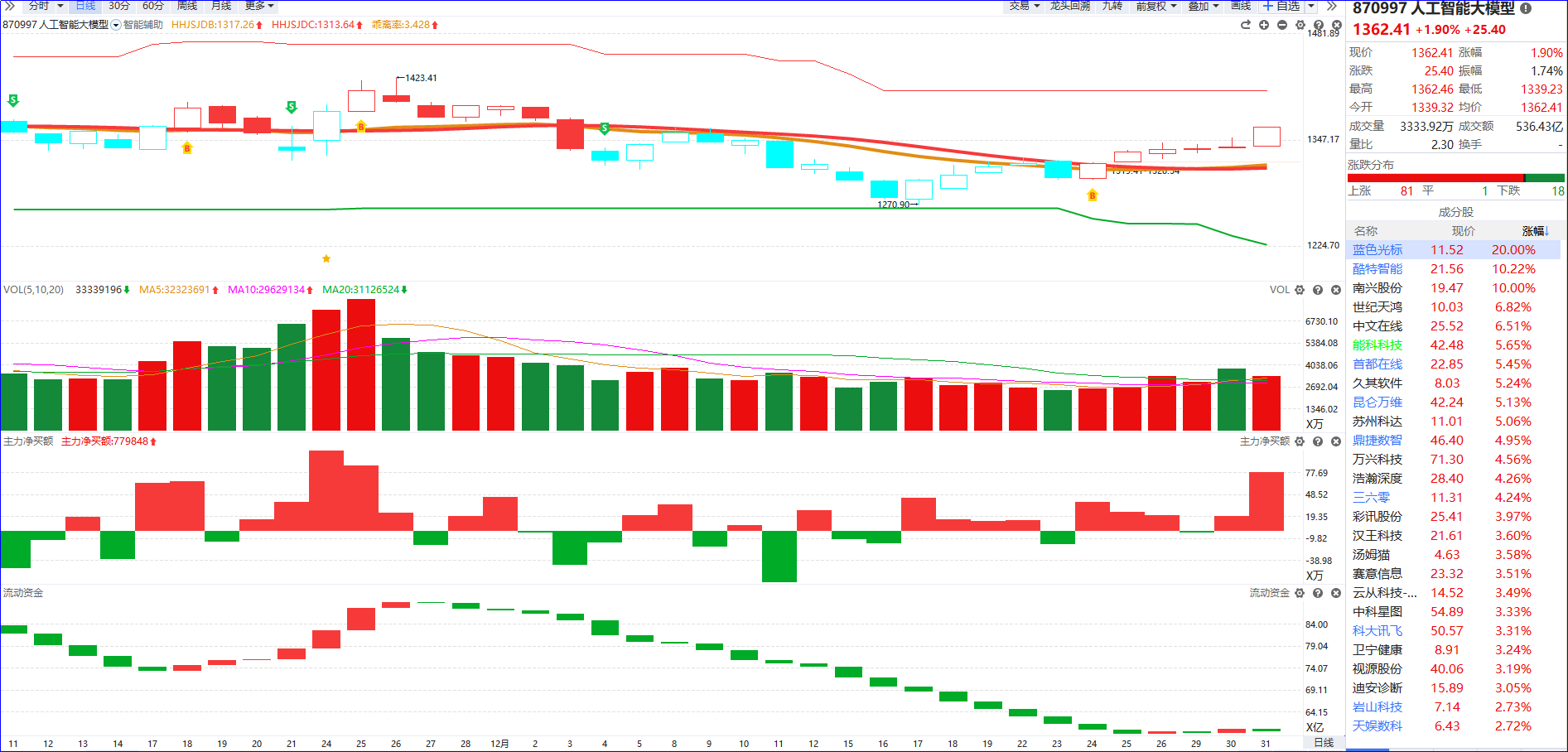 从软件信号看,AI智能体板块近期流动资金以翻红为主,主力净买额今日红柱显著增强。股价经历震荡后,上午收出实体阳线,资金面与趋势共振走强。板块中军蓝色光标20CM涨停,有效带动板块热度攀升。后续操作可聚焦5日主力排序靠前、流动资金翻红为主或主力控盘程度递增的个股,把握上升回档机会。