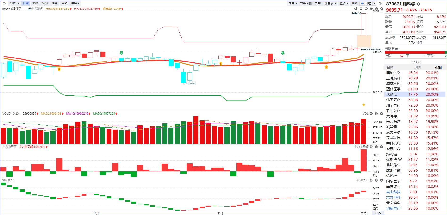 从软件信号看,脑科学板块近期流动资金持续翻红、主力净买额红肥绿瘦。受消息面催化,板块成功突破前期震荡平台,以放量长阳形态强势启动,板块内涨停家数超20家。从个股表现来看,多数涨停标的偏向量化资金集体布局的特征,短线情绪过度一致易引发板块内部分化。操作上需回避高潮节点追涨,耐心等待板块分歧调整阶段,重点聚焦5日主力资金排序靠前个股中,出现缩量回档走势的标的。