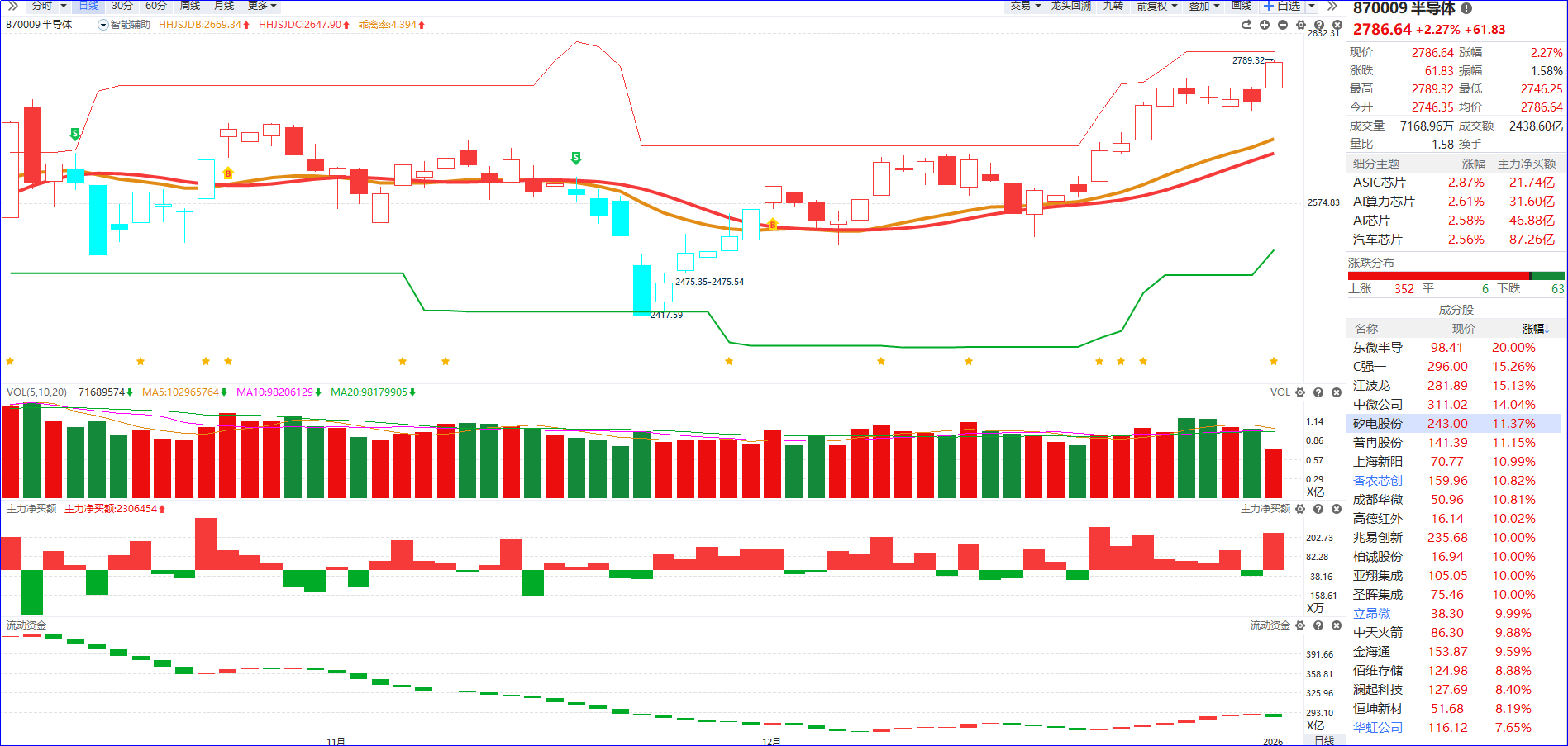从软件信号看,半导体板块近期流动资金持续翻红,主力净买额呈现红肥绿瘦,资金流入优势显著。在前期趋势已逐步强化的基础上,板块经历震荡整理后再度收出中阳K线,趋势延续性进一步凸显。后续可聚焦板块内5日主力资金排序居前、且主力控盘度持续递增的个股,把握其上升回档后的介入机会。