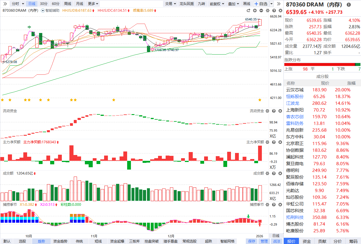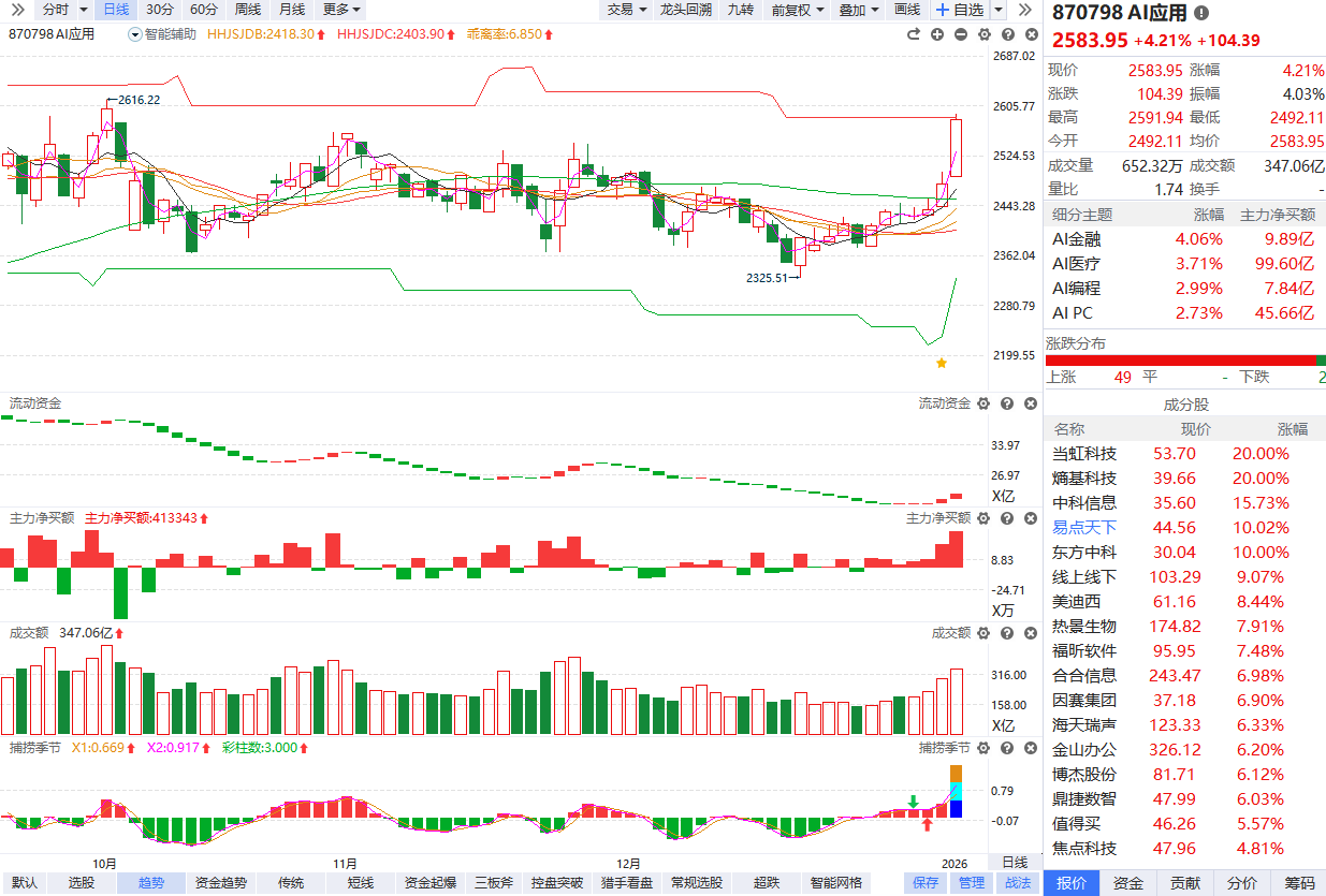 根据软件信号,板块近期流动资金持续翻红,主力净买额红肥绿瘦,资金强势背景下熊线上移强趋势启动。目前已经金叉反弹3个交易日且捕捞季节出现光头彩柱,短线需要注意回避冲高追涨,耐心等待缩量回档的性价比布局节点。