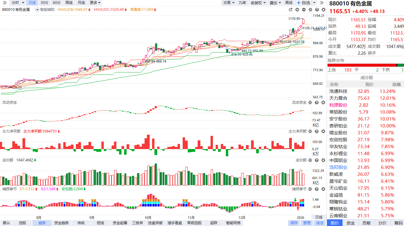 有色板块再度走强,铜、铝等工业金属方向领涨,洛阳钼业、宏创控股、中矿资源、紫金矿业涨超4%,创历史新高,此前贵研铂业涨停,华友钴业、锡业股份、中国铝业、华锡有色等跟涨。