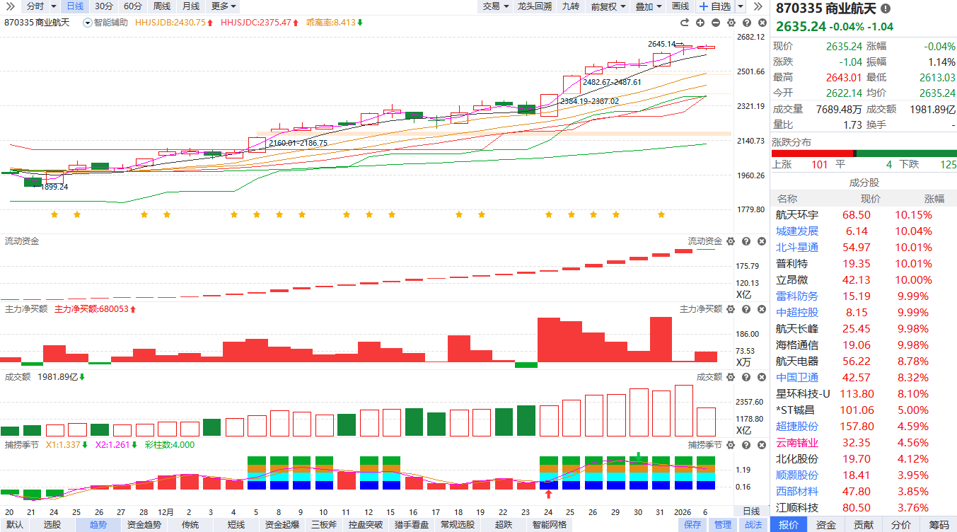 根据软件信号,板块近期流动资金持续翻红,主力净买额红肥绿瘦,资金强势背景下熊线上移强趋势启动。目前已经金叉反弹3个交易日且捕捞季节连续出现光头彩柱,短线需要注意回避冲高追涨,耐心等待缩量回档的性价比布局节点。
