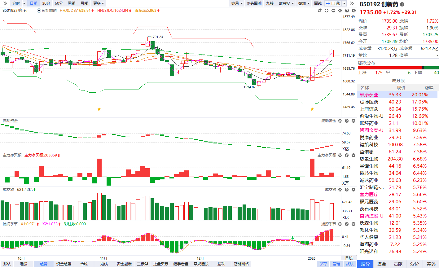 根据软件信号,板块近期流动资金持续翻红走高,主力净买额红肥绿瘦,资金强势背景下板块放量突破平台,熊线上移趋势启动,形成沿着5日线震荡上行的强趋势。目前已经金叉反弹多个交易日,短线如果再度急涨容易出现内部分化,注意回避冲高追涨,耐心等待缩量回档的性价比博弈机会。