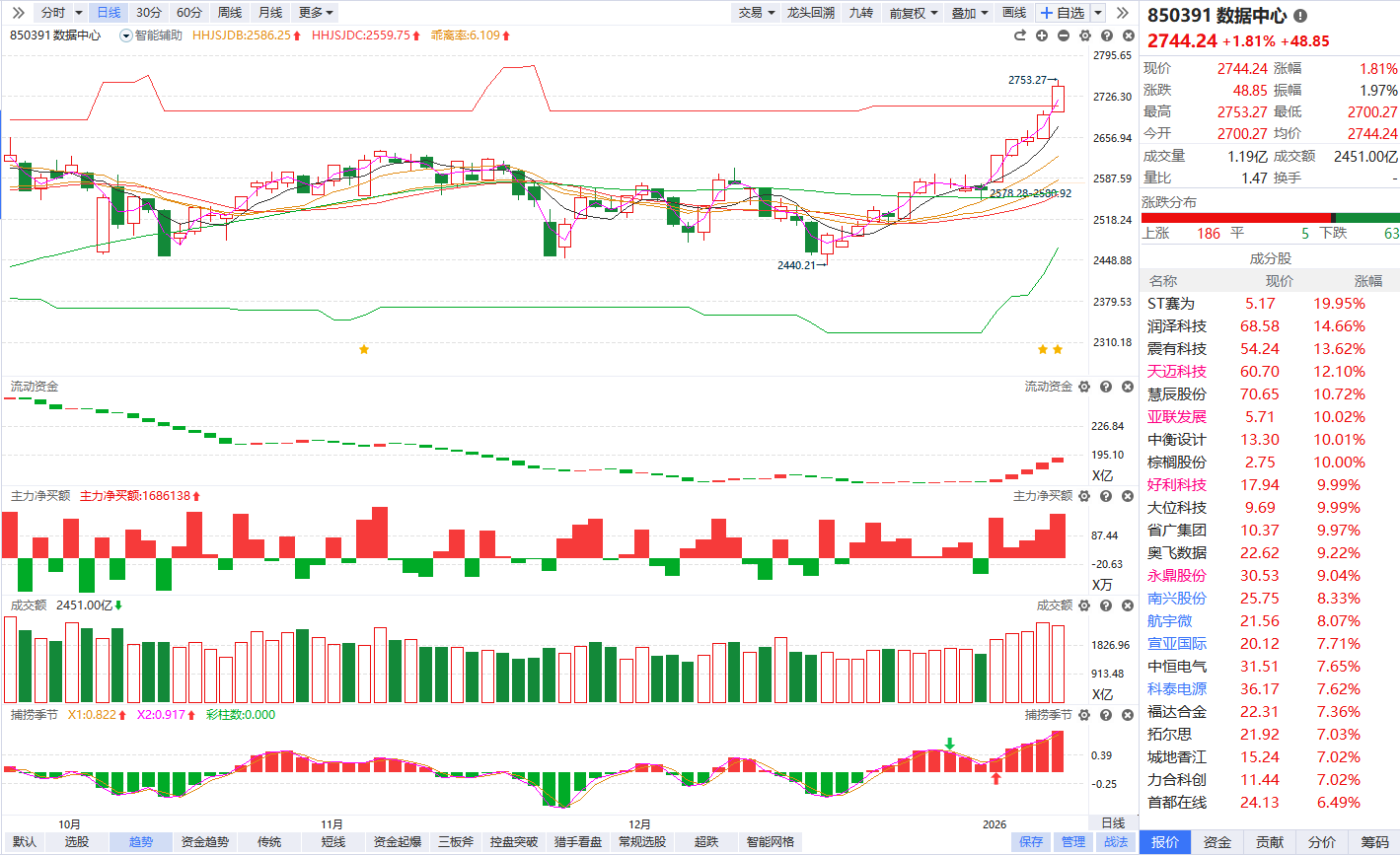 根据软件信号,板块近期流动资金持续翻红,主力净买额红肥绿瘦,资金强势背景下放量突破横盘平台,形成沿着5日线震荡上行的强趋势,60分钟回踩辅助线的回档节点可以积极留意低位启动个股的低吸博弈。