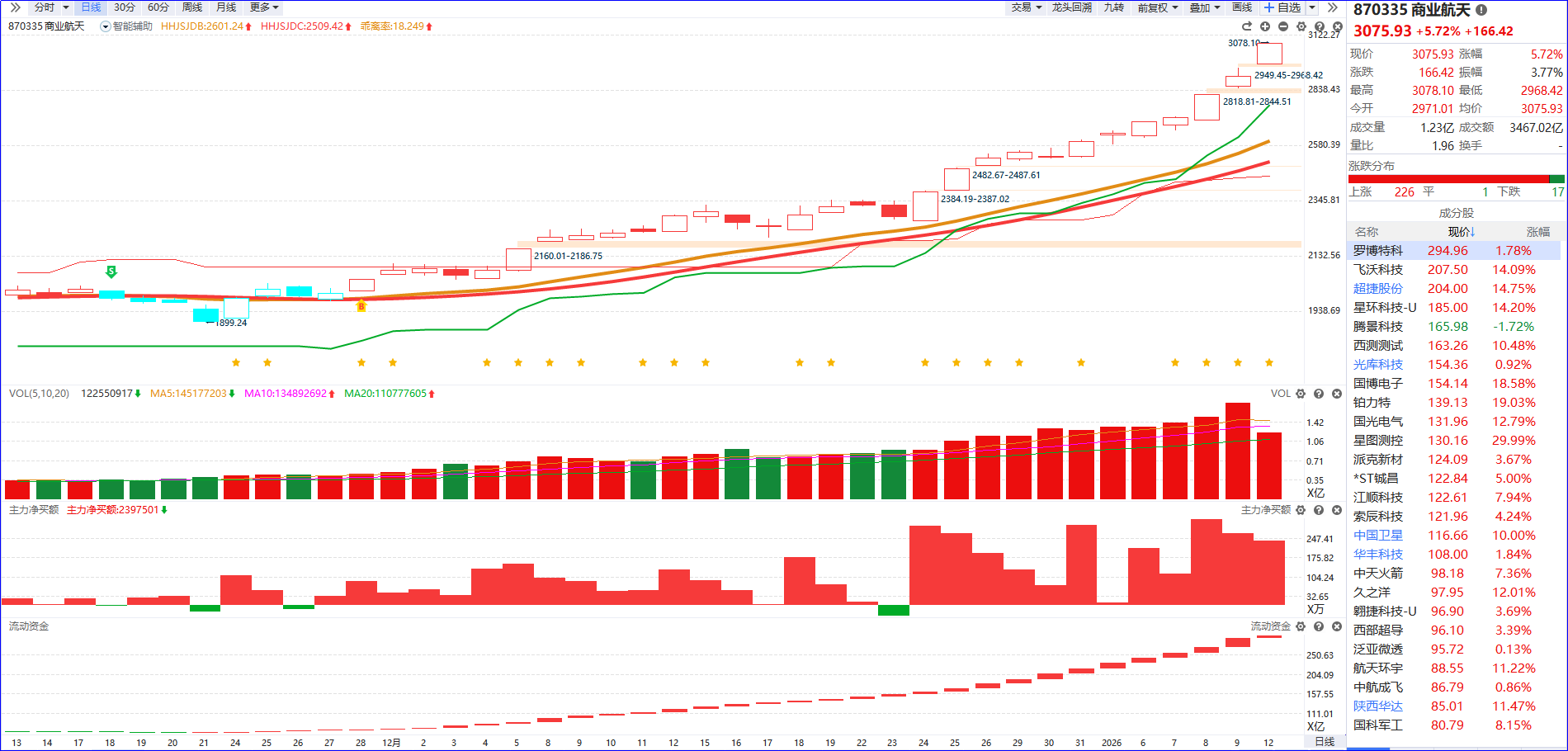 从软件信号来看,商业航天是近期市场热钱聚焦度最高的方向,流动资金持续保持翻红状态,主力净买入额呈现红肥绿瘦的强势格局。作为当前资金介入深度最深的板块,该方向具备极强的活跃惯性,在增量资金持续进场的环境下,大概率形成复合顶结构;只要高位股未出现集体退潮的明确信号,短线题材炒作的热度大概率将持续延续。