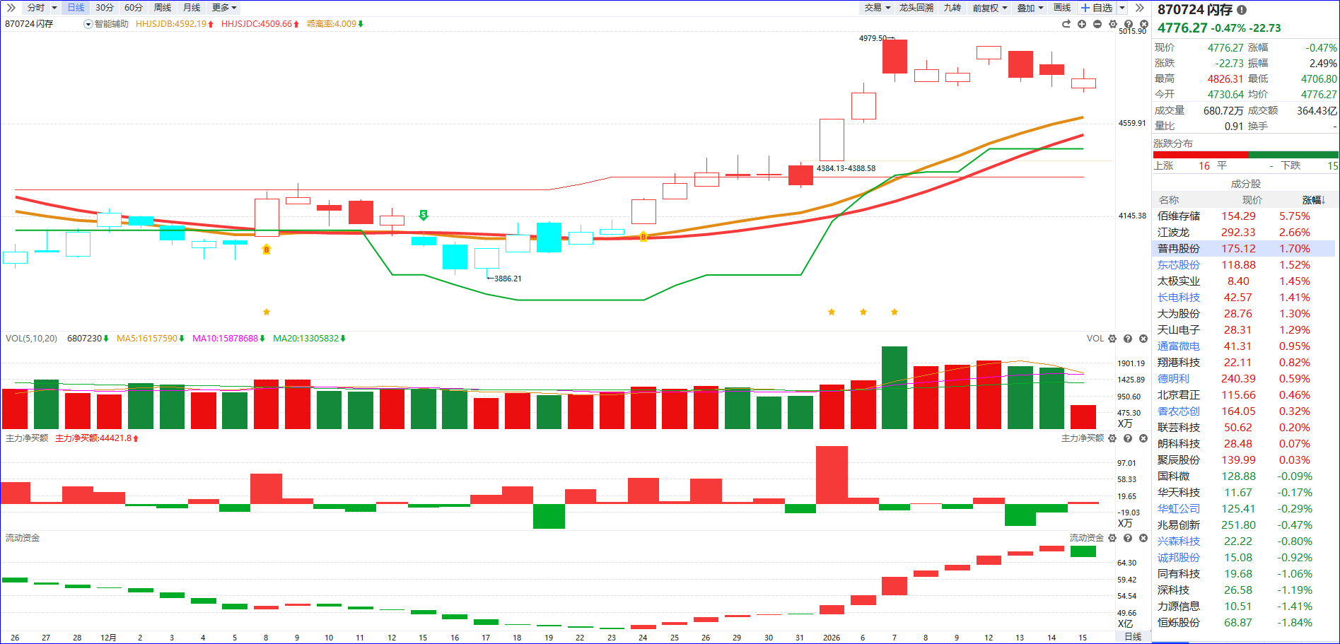 从软件信号看,存储芯片板块近期流动资金持续翻红,但主力净买额以翻绿为主,整体处于震荡整理阶段。在消息面催化下,板块内部分业绩向好的核心标的已出现上涨行情。后续布局需聚焦三大核心维度:业绩预期向好、流动资金维持翻红、主力控盘力度逐步提升的标的。